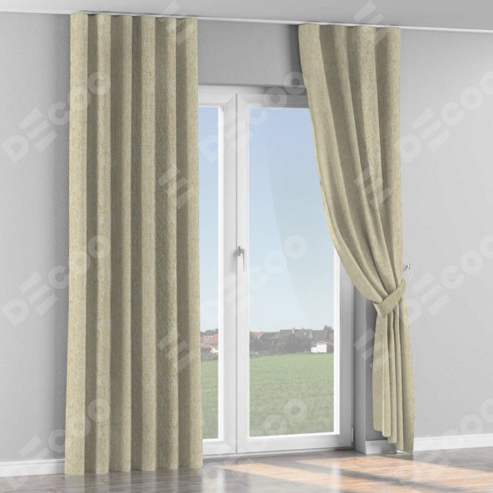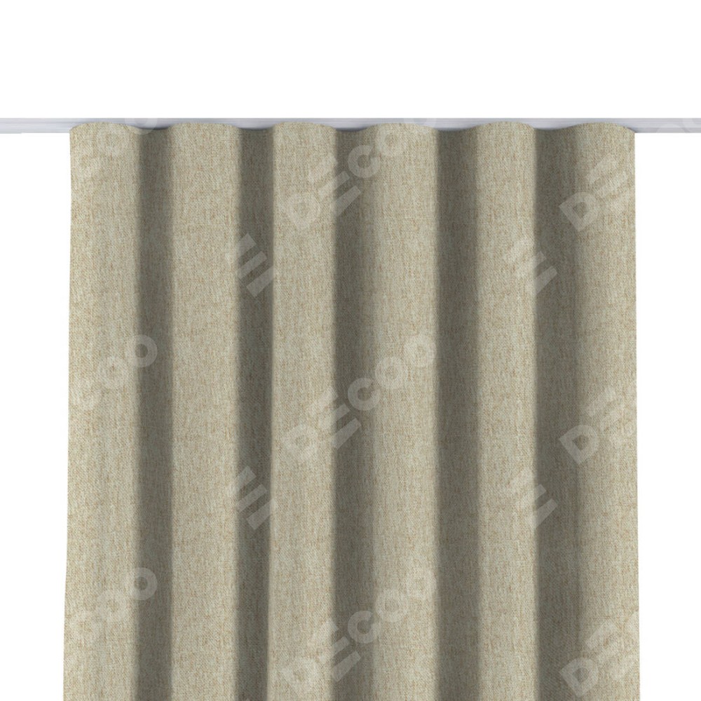Комплект прямых штор, от производителя «Cortin», пошиты из ткани стиф димаут светло-бежевый, артикул ткани 18084. С изнаночной стороны в верхней части штор пристрачивается шторная лента с декоративными складками «Волна». Для создания элегантных складок прямые шторы шьются по стандарту с коэффициентом 1:2 (на 100 см. ширины проёма 200 см. ширины ткани).