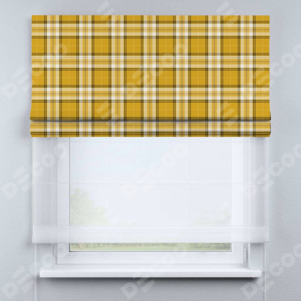Римская штора день-ночь производителя «Cortin», используется для проёма, пошита из двух полотен, с лицевой блэкаут с нанесением сублимационной печати «Желто-горчичная клетка», вторая ткань тюль (по стандарту комплектуется тюль белого цвета артикул V-01). Имеет универсальный механизм и подходит для монтажа: на потолок, на стену и в нишу.