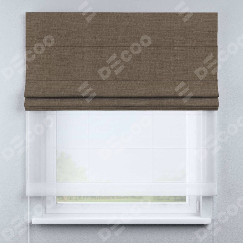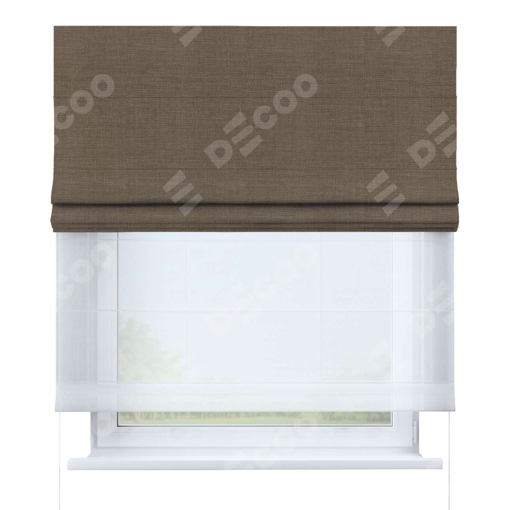 Римская штора день-ночь производителя «Cortin», используется для проёма, пошита из двух полотен, с лицевой стороны лён мокко артикул 7444, вторая ткань тюль (по стандарту комплектуется тюль белого цвета артикул V-01). Имеет универсальный механизм и подходит для монтажа: на потолок, на стену и в нишу.