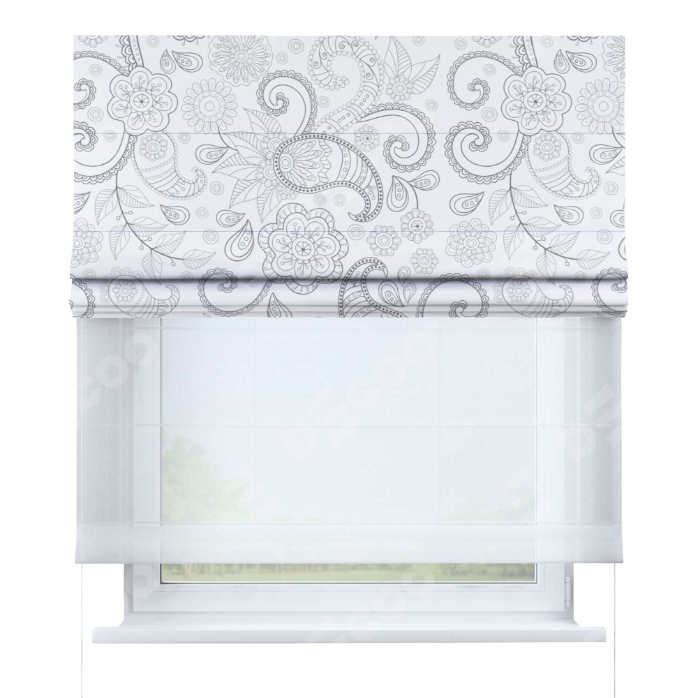 Римская штора день-ночь производителя «Cortin», используется для проёма, пошита из двух полотен, с лицевой блэкаут с нанесением сублимационной печати «Изысканный пейсли», вторая ткань тюль (по стандарту комплектуется тюль белого цвета артикул V-01). Имеет универсальный механизм и подходит для монтажа: на потолок, на стену и в нишу.