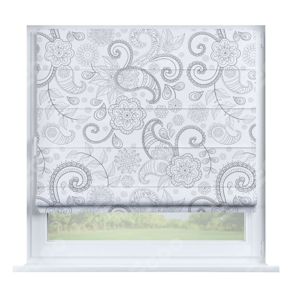 Римская штора производителя «Cortin», устанавливается на створку окна, пошита из ткани блэкаут с нанесением сублимационной печати «Изысканный пейсли». Штора шьётся по индивидуальным размерам, для данного типа римской шторы возможная ширина от 35 до 150 см., высота до 250 см.