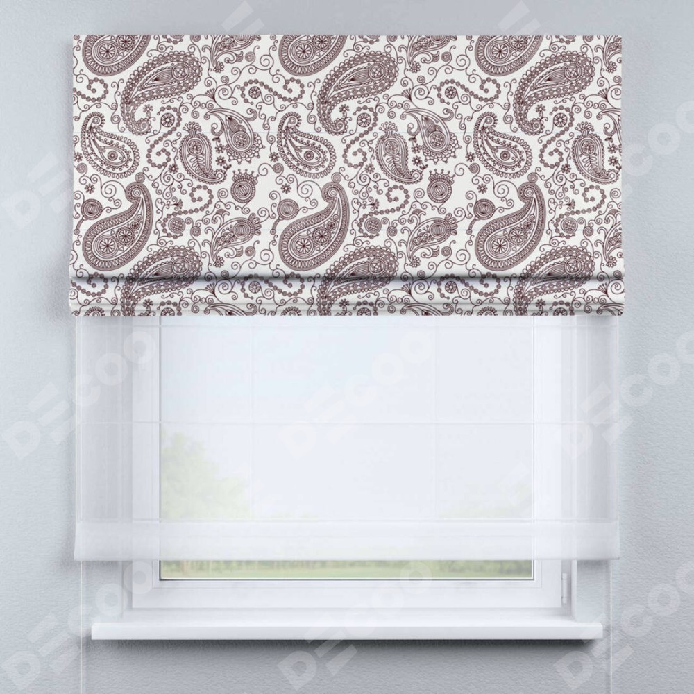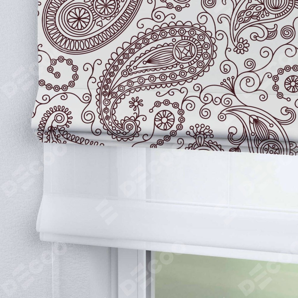 Римская штора день-ночь производителя «Cortin», используется для проёма, пошита из двух полотен, с лицевой блэкаут с нанесением сублимационной печати «Индийский узор», вторая ткань тюль (по стандарту комплектуется тюль белого цвета артикул V-01). Имеет универсальный механизм и подходит для монтажа: на потолок, на стену и в нишу.
