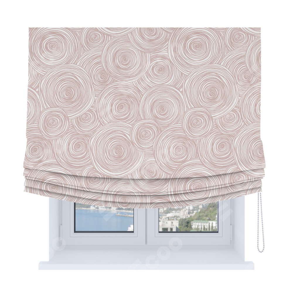 Римская штора Soft производителя «Cortin», используется для проёма, пошита из ткани блэкаут с нанесением сублимационной печати «Бежевые круги». Имеет универсальный механизм и подходит для монтажа: на потолок, на стену и в нишу. В отличие от стандартных римских штор, римская штора Soft не имеет горизонтальных вставок и нижнего отвеса. Это позволяет ткани произвольно драпироваться в свободные мягкие складки.