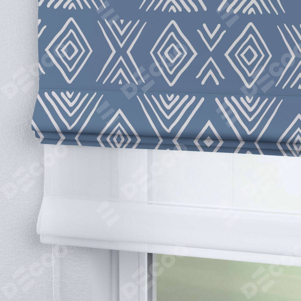 Римская штора день-ночь производителя «Cortin», используется для проёма, пошита из двух полотен, с лицевой блэкаут с нанесением сублимационной печати «Графический орнамент», вторая ткань тюль (по стандарту комплектуется тюль белого цвета артикул V-01). Имеет универсальный механизм и подходит для монтажа: на потолок, на стену и в нишу.