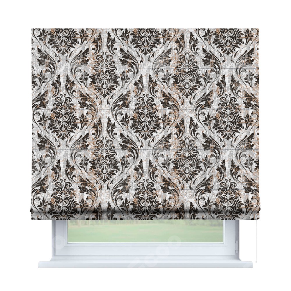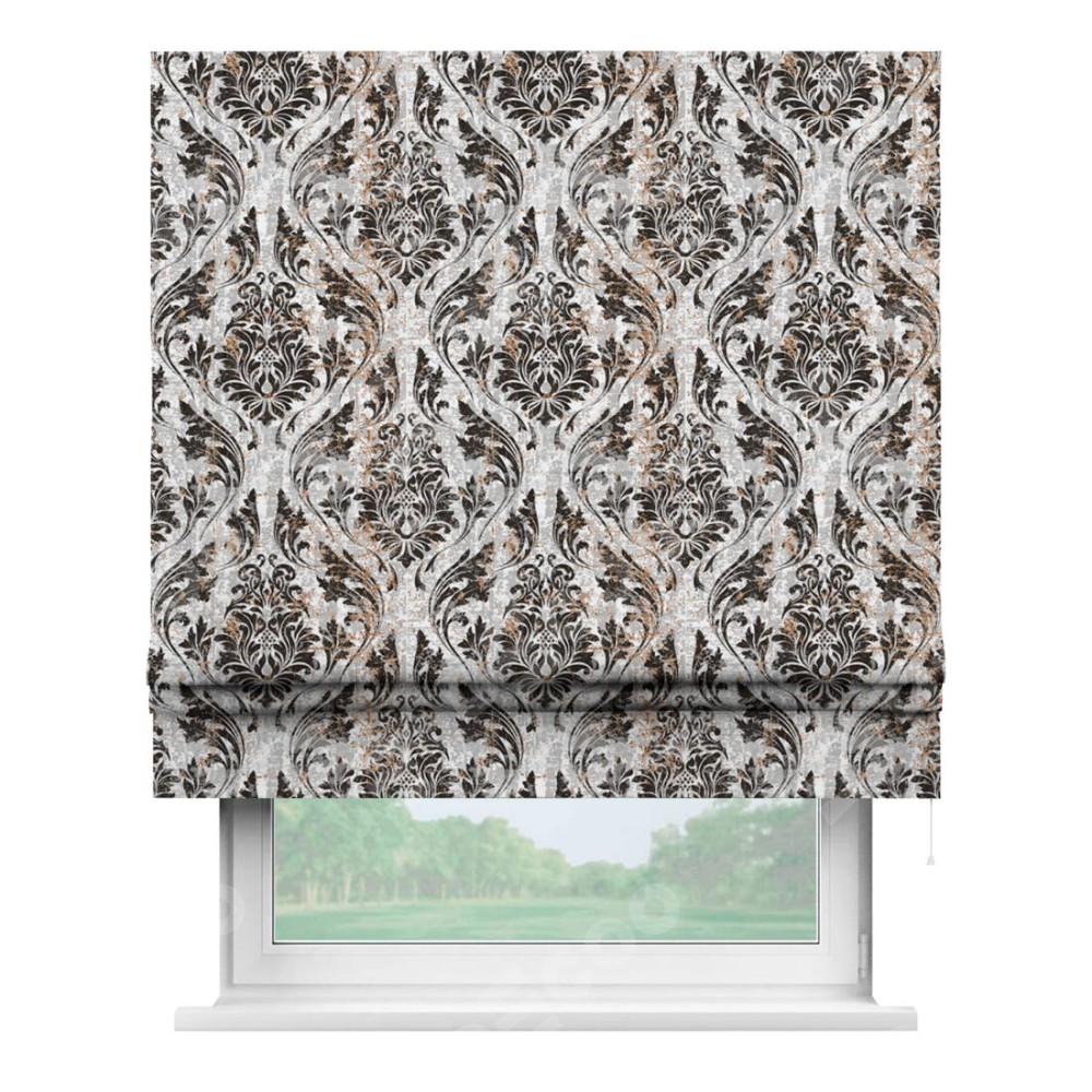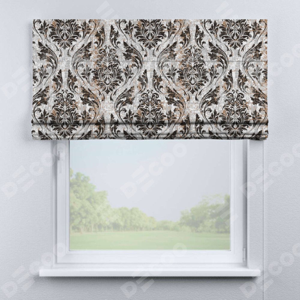 Римская штора производителя «Cortin», используется для проёма, пошита из ткани блэкаут с нанесением сублимационной печати «Дамаск тёмный». Имеет универсальный механизм и подходит для монтажа: на потолок, на стену и в нишу.