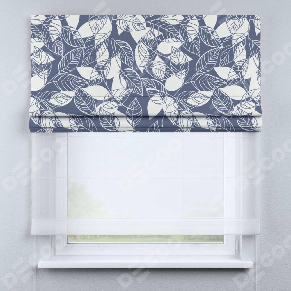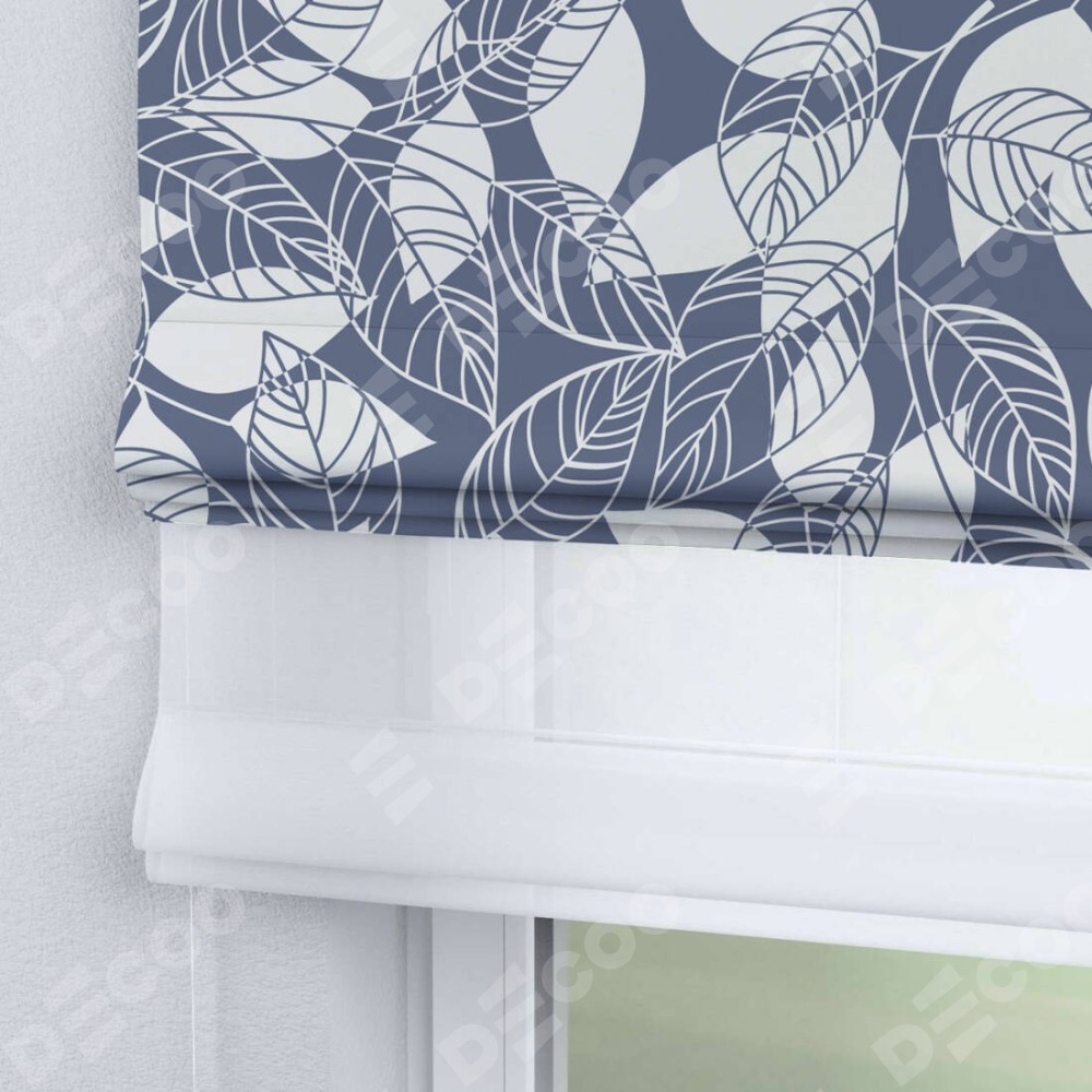 Римская штора день-ночь производителя «Cortin», используется для проёма, пошита из двух полотен, с лицевой блэкаут с нанесением сублимационной печати «Прозрачные листья», вторая ткань тюль (по стандарту комплектуется тюль белого цвета артикул V-01). Имеет универсальный механизм и подходит для монтажа: на потолок, на стену и в нишу.