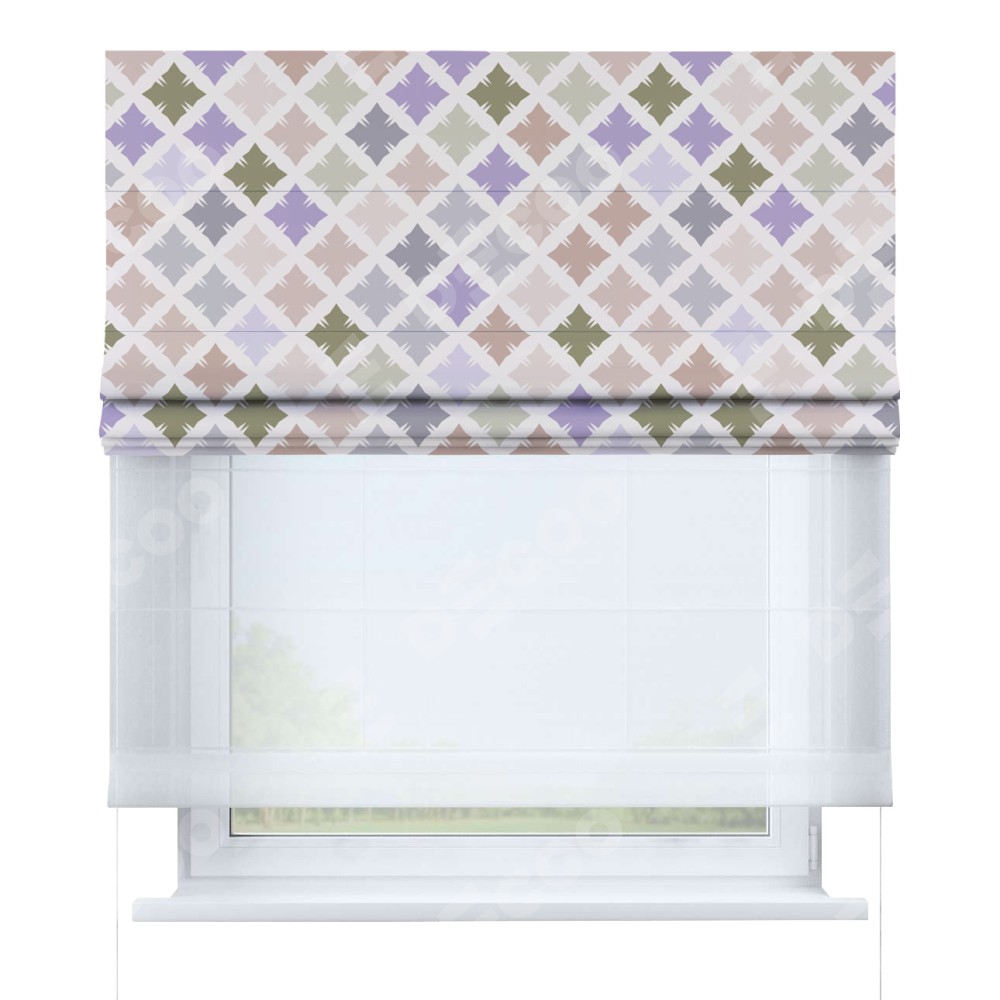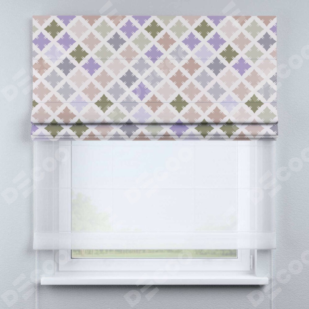 Римская штора день-ночь производителя «Cortin», используется для проёма, пошита из двух полотен, с лицевой блэкаут с нанесением сублимационной печати «Фигурные плитки», вторая ткань тюль (по стандарту комплектуется тюль белого цвета артикул V-01). Имеет универсальный механизм и подходит для монтажа: на потолок, на стену и в нишу.
