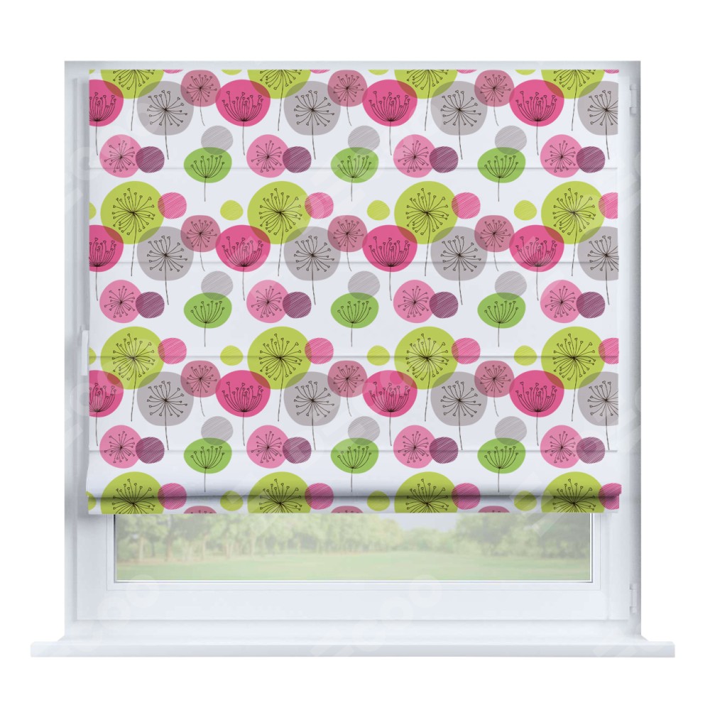 Римская штора производителя «Cortin», устанавливается на створку окна, пошита из ткани блэкаут с нанесением сублимационной печати «Цветные одуванчики». Штора шьётся по индивидуальным размерам, для данного типа римской шторы возможная ширина от 35 до 150 см., высота до 250 см.