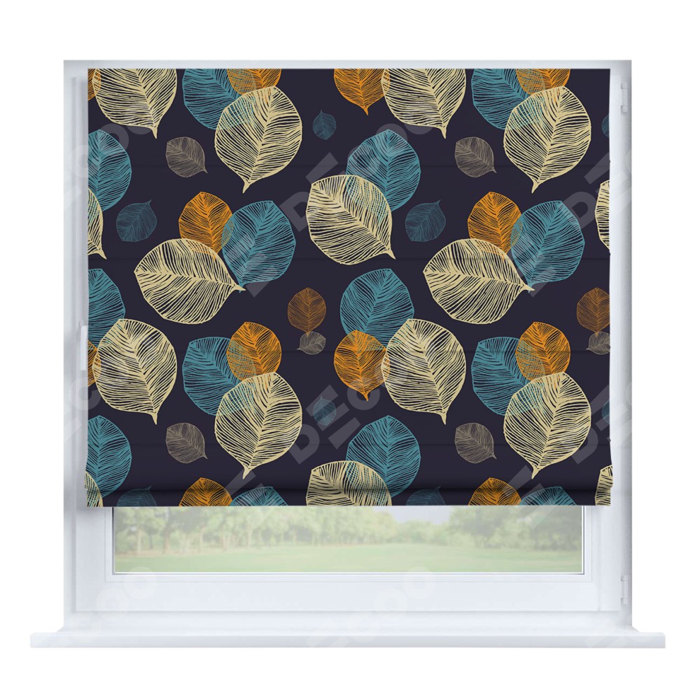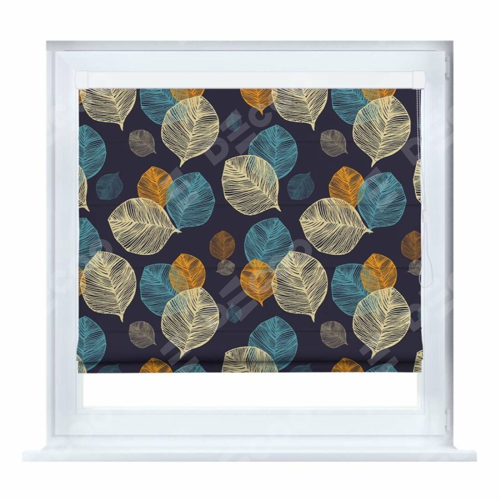 Римская штора производителя «Cortin», устанавливается на створку окна, пошита из ткани блэкаут с нанесением сублимационной печати «Листья в ночи». Штора шьётся по индивидуальным размерам, для данного типа римской шторы возможная ширина от 35 до 150 см., высота до 250 см.
