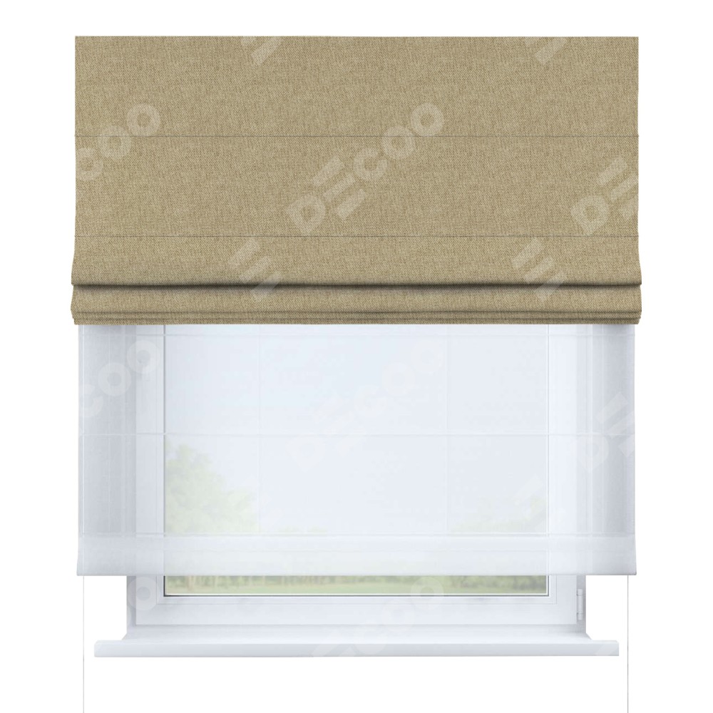 Римская штора день-ночь производителя «Cortin», используется для проёма, пошита из двух полотен, с лицевой стороны стиф димаут бежевый артикул 18083, вторая ткань тюль (по стандарту комплектуется тюль белого цвета артикул V-01). Имеет универсальный механизм и подходит для монтажа: на потолок, на стену и в нишу.