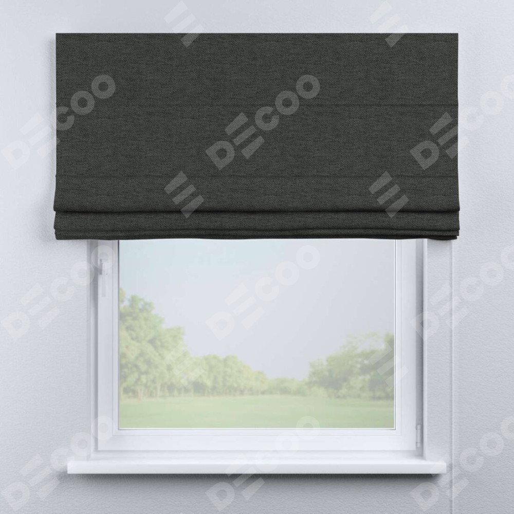 Римская штора производителя «Cortin», используется для проёма, пошита из ткани стиф димаут графит, артикул ткани 44026. Имеет универсальный механизм и подходит для монтажа: на потолок, на стену и в нишу.