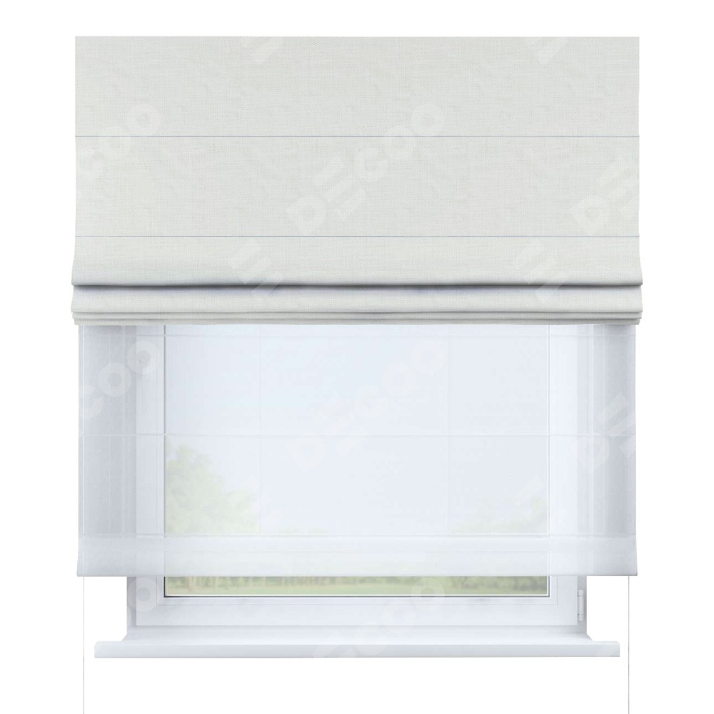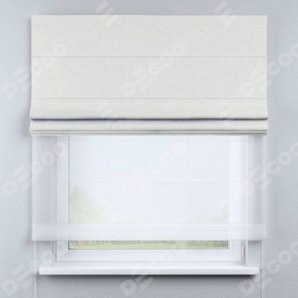 Римская штора день-ночь производителя «Cortin», используется для проёма, пошита из двух полотен, с лицевой стороны лён молочный артикул 23568, вторая ткань тюль (по стандарту комплектуется тюль белого цвета артикул V-01). Имеет универсальный механизм и подходит для монтажа: на потолок, на стену и в нишу.