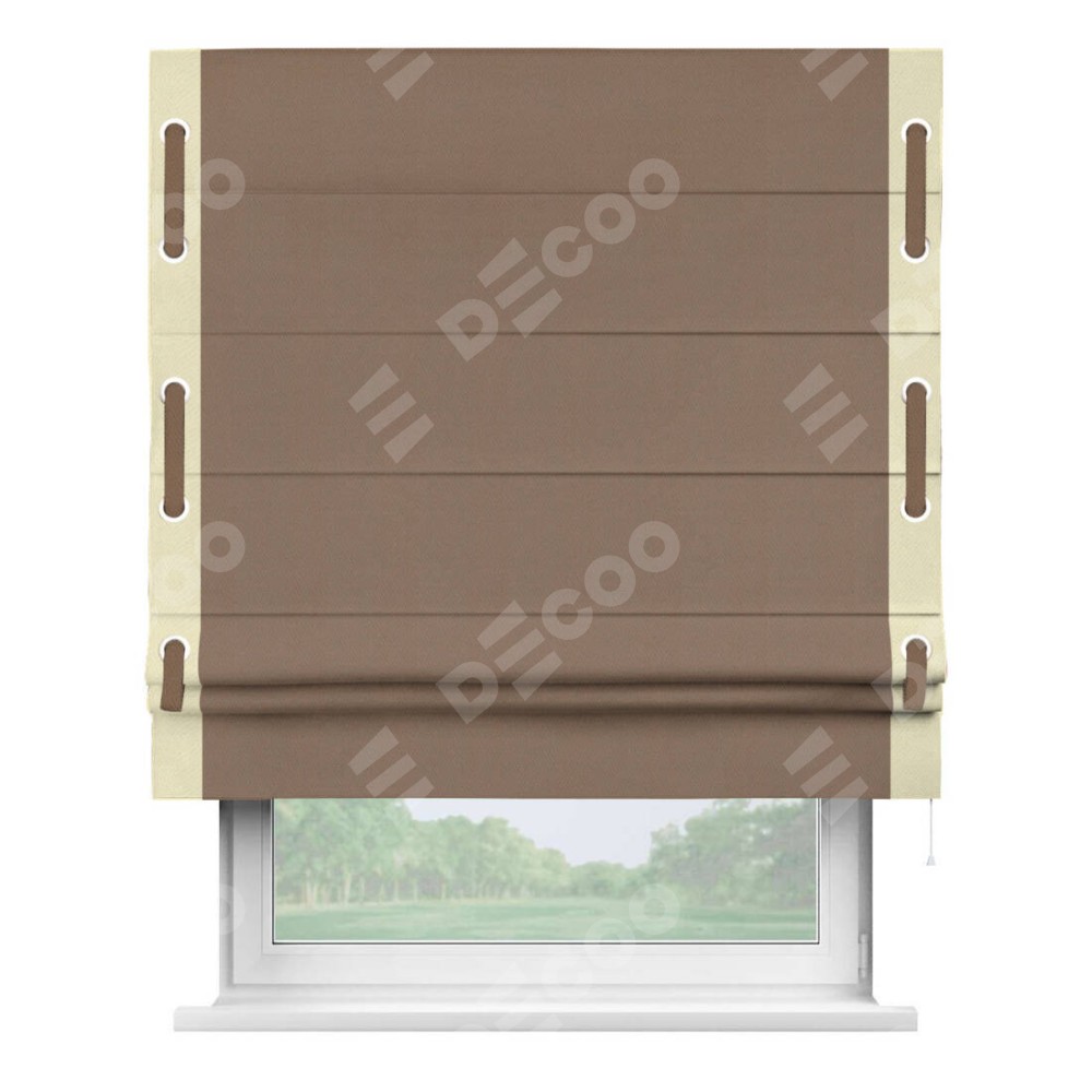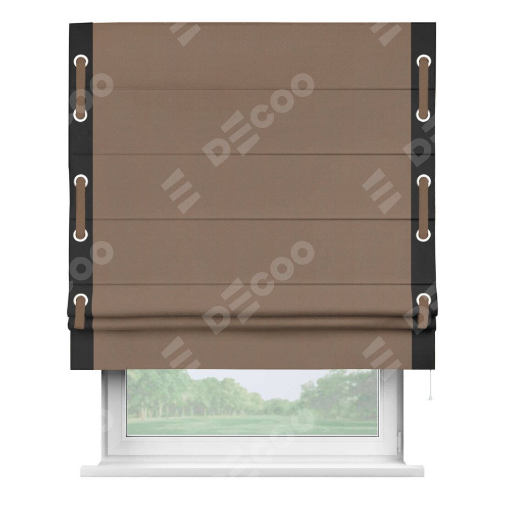 Римская штора производителя «Cortin», используется для проёма, пошита из ткани блэкаут однотонный коричневый, артикул ткани 88285. Отделка шторы кантом «Стрим Дуо» на кантах расположены люверсы с пояском, ткань для канта используется из блэкаута однотонного разной расцветки на выбор. Ткань для пояска обычно используется из основной ткани шторы, а так же можно сделать из любой расцветки по желанию. Имеет универсальный механизм и подходит для монтажа: на потолок, на стену и в нишу.