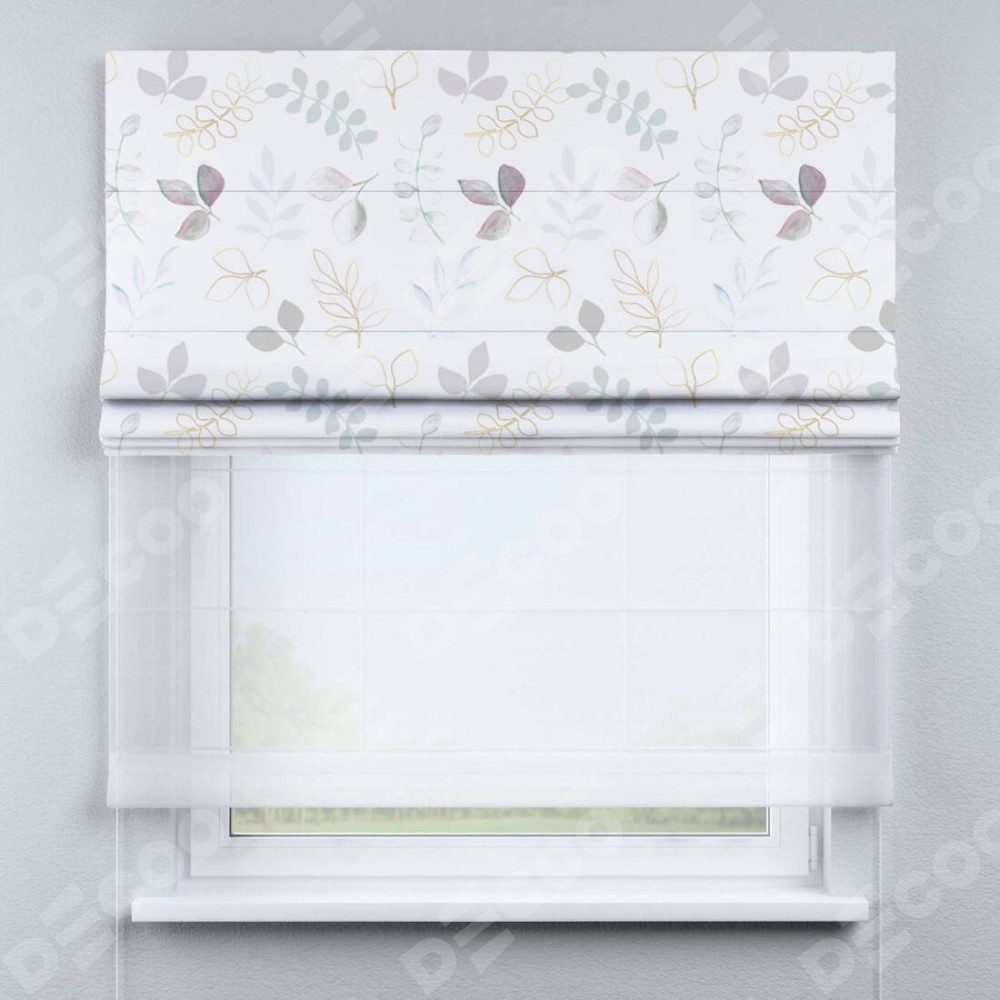 Римская штора день-ночь производителя «Cortin», используется для проёма, пошита из двух полотен, с лицевой блэкаут с нанесением сублимационной печати «Весенняя акварель», вторая ткань тюль (по стандарту комплектуется тюль белого цвета артикул V-01). Имеет универсальный механизм и подходит для монтажа: на потолок, на стену и в нишу.