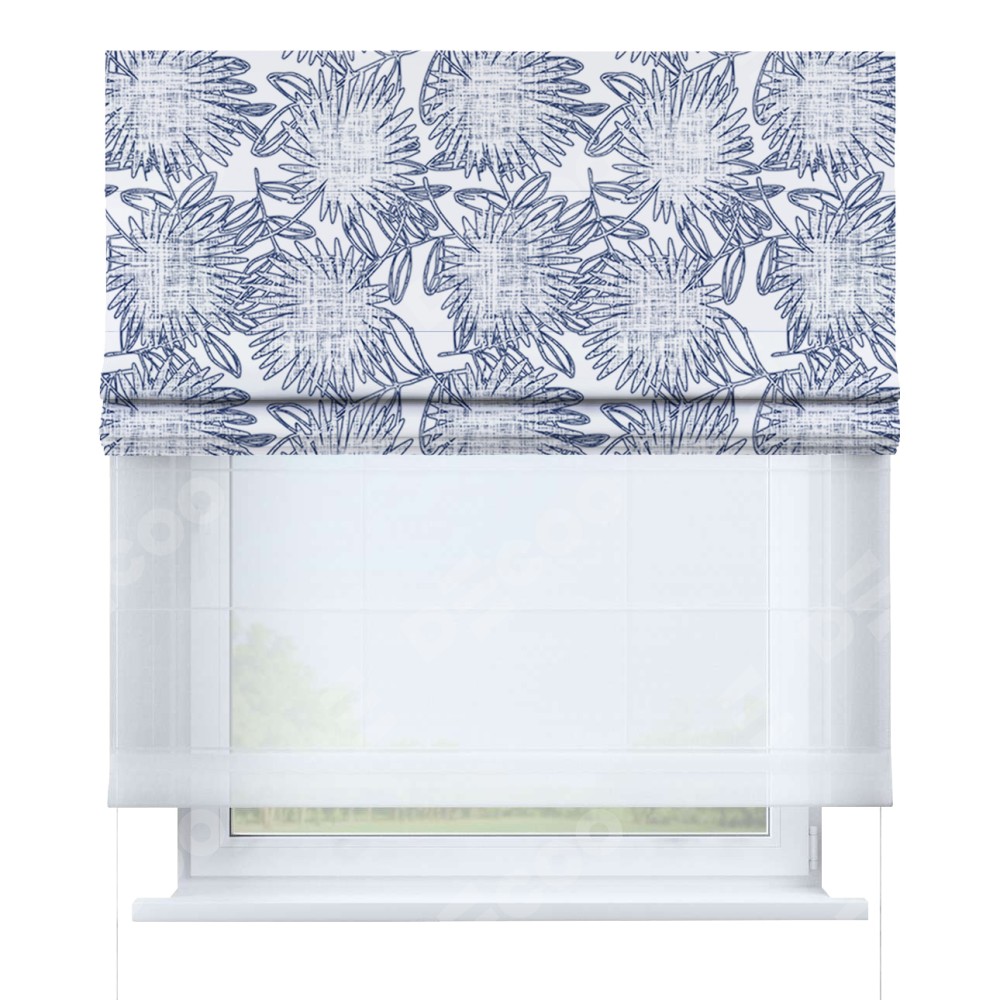 Римская штора день-ночь производителя «Cortin», используется для проёма, пошита из двух полотен, с лицевой блэкаут с нанесением сублимационной печати «Синий букет», вторая ткань тюль (по стандарту комплектуется тюль белого цвета артикул V-01). Имеет универсальный механизм и подходит для монтажа: на потолок, на стену и в нишу.