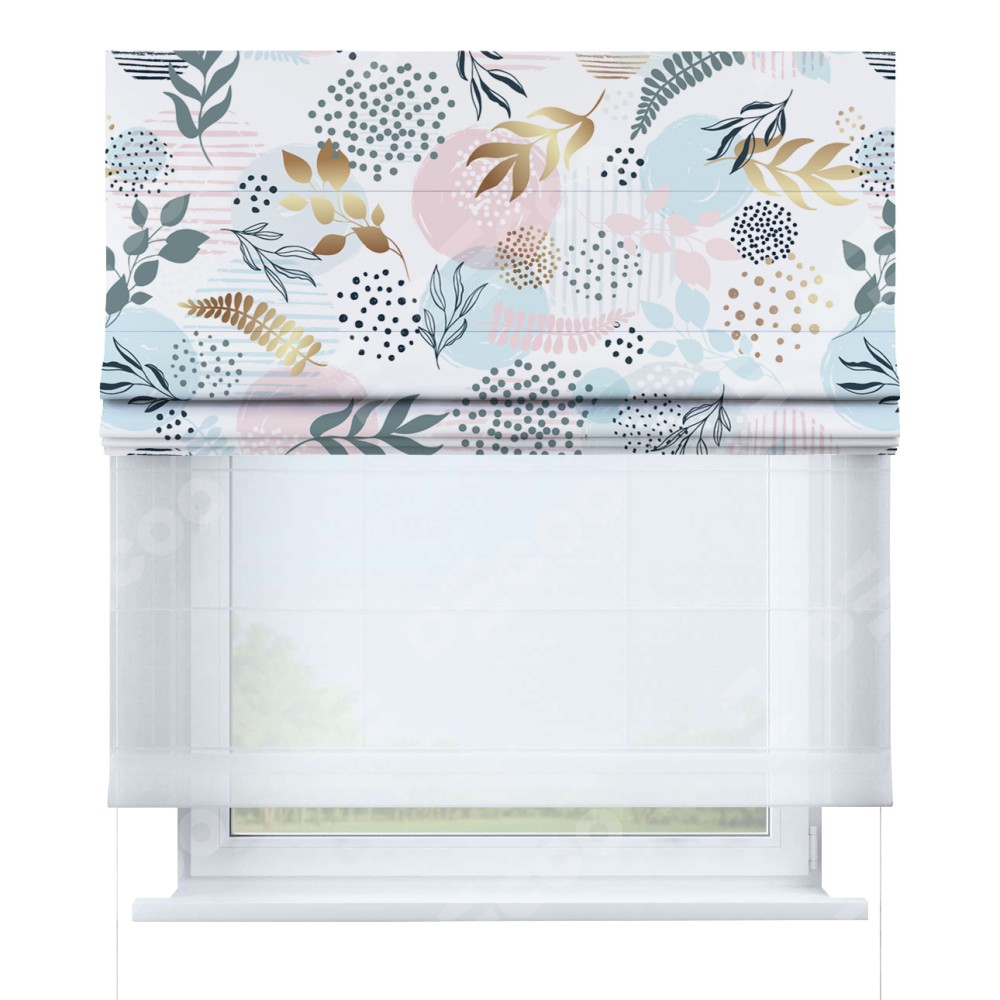 Римская штора день-ночь производителя «Cortin», используется для проёма, пошита из двух полотен, с лицевой блэкаут с нанесением сублимационной печати «Точки и листочки», вторая ткань тюль (по стандарту комплектуется тюль белого цвета артикул V-01). Имеет универсальный механизм и подходит для монтажа: на потолок, на стену и в нишу.