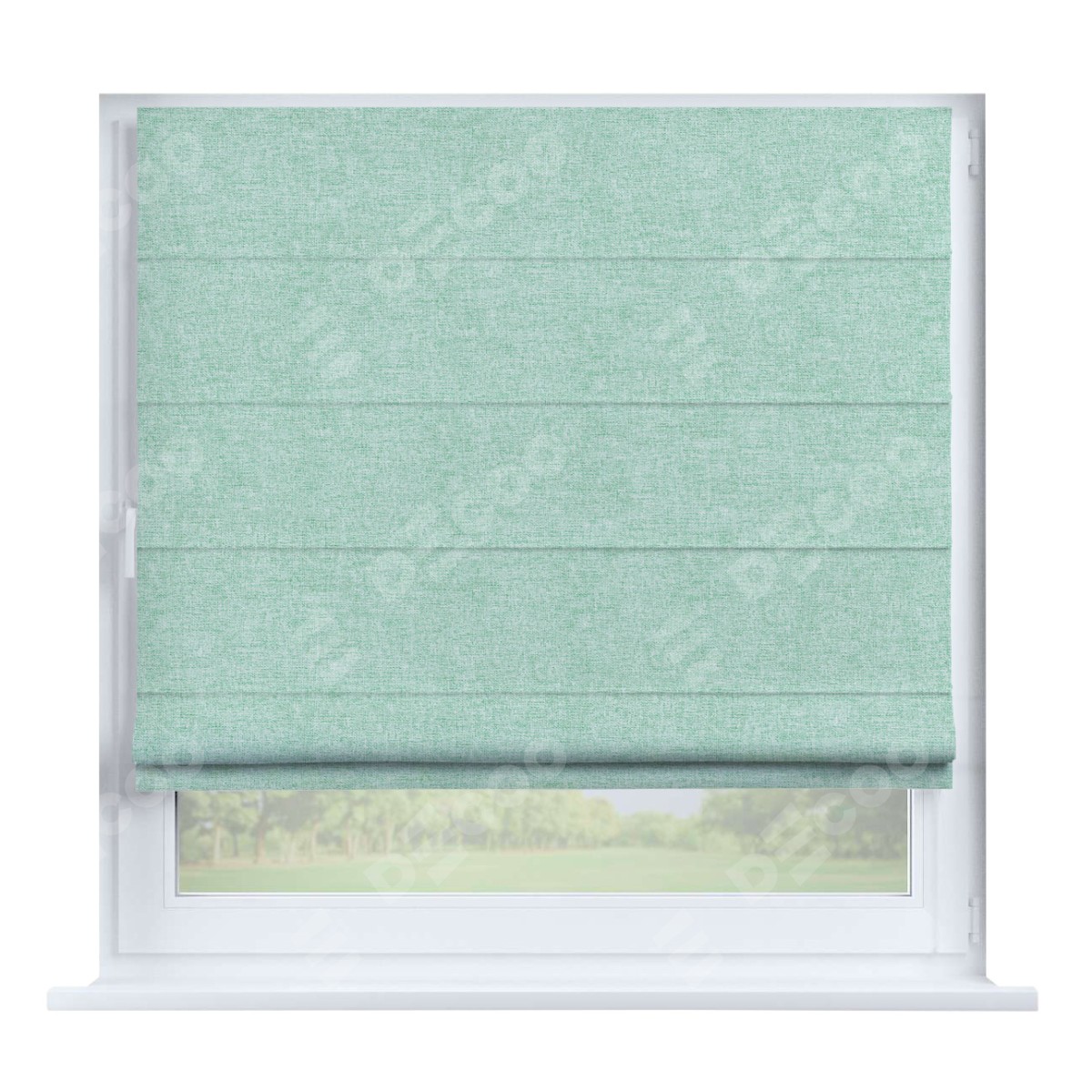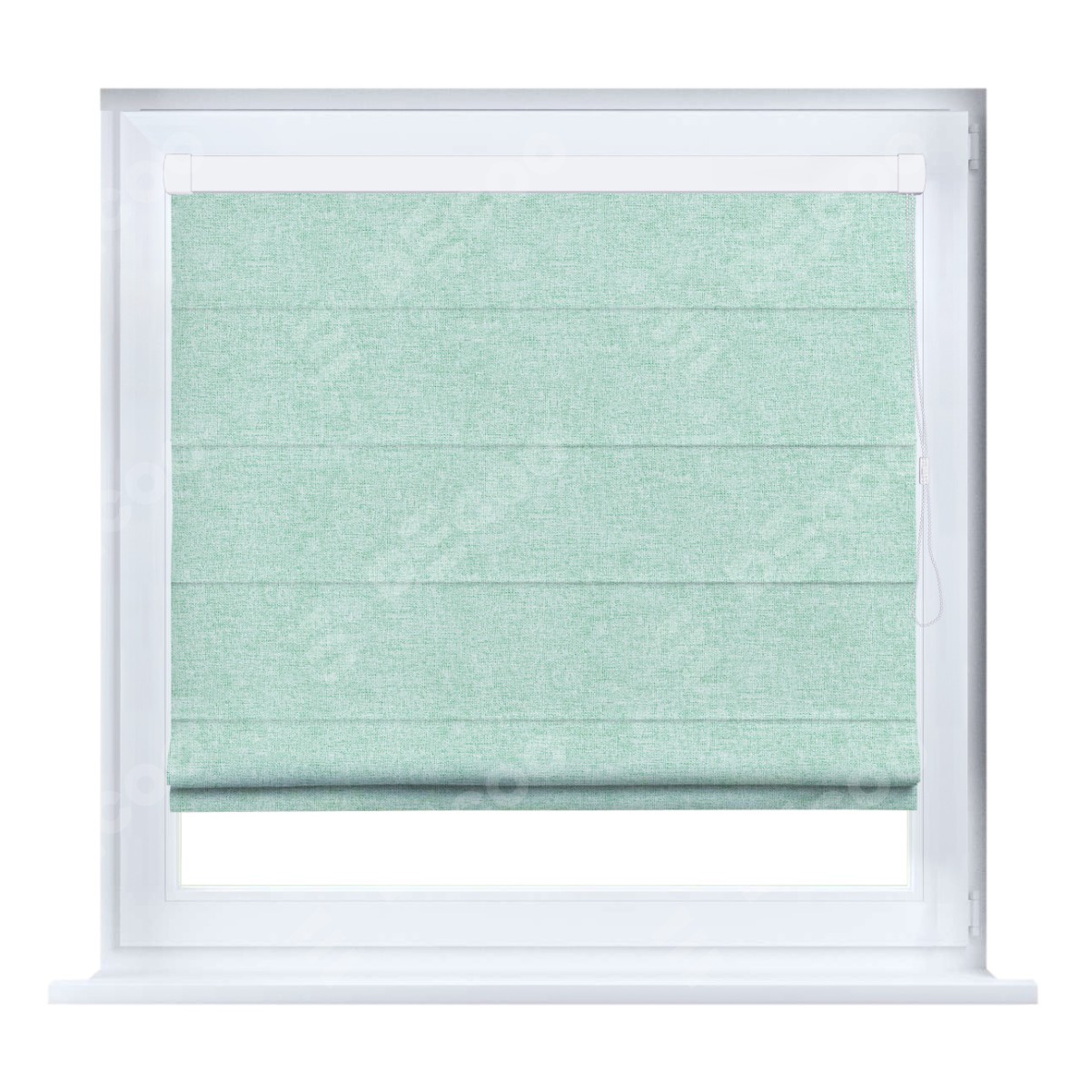 Римская штора производителя «Cortin», устанавливается на створку окна, пошита из ткани лён кашемир мятный, артикул 21617. Штора шьётся по индивидуальным размерам, для данного типа римской шторы возможная ширина от 35 до 150 см., высота до 250 см.
