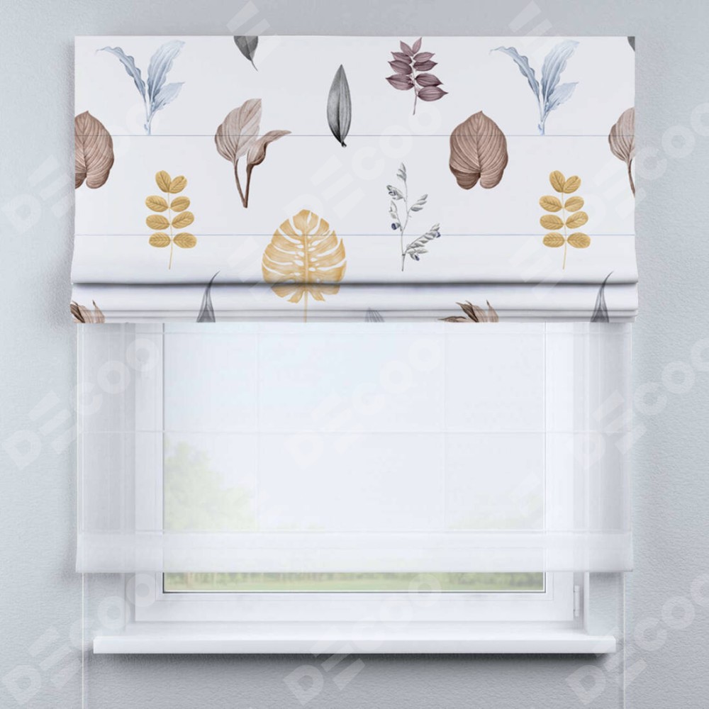 Римская штора день-ночь производителя «Cortin», используется для проёма, пошита из двух полотен, с лицевой блэкаут с нанесением сублимационной печати «Осенний коллаж», вторая ткань тюль (по стандарту комплектуется тюль белого цвета артикул V-01). Имеет универсальный механизм и подходит для монтажа: на потолок, на стену и в нишу.