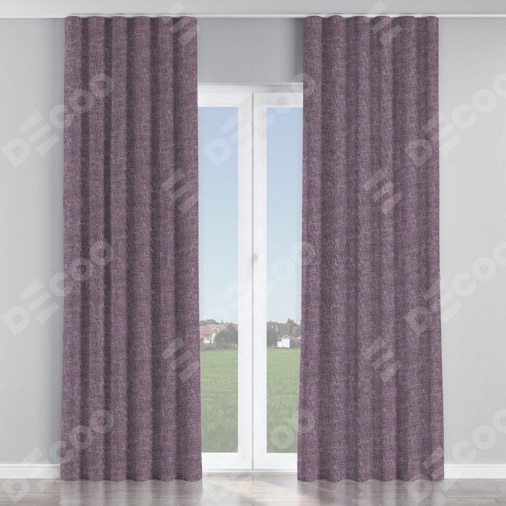 Комплект прямых штор, от производителя «Cortin», пошиты из ткани лён кашемир фиолетовый, артикул ткани 17211. С изнаночной стороны в верхней части штор пристрачивается шторная лента с декоративными складками «Волна». Для создания элегантных складок прямые шторы шьются по стандарту с коэффициентом 1:2 (на 100 см. ширины проёма 200 см. ширины ткани).
