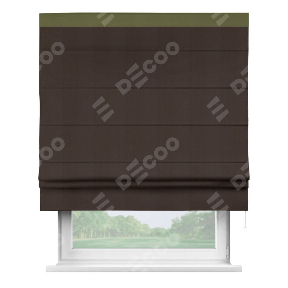 Римская штора производителя «Cortin», используется для проёма, пошита из ткани блэкаут однотонный тёмно-коричневый, артикул ткани 88287. Отделка шторы кантом «Кинг», ткань для канта используется из блэкаута однотонного разной расцветки на выбор. Имеет универсальный механизм и подходит для монтажа: на потолок, на стену и в нишу.