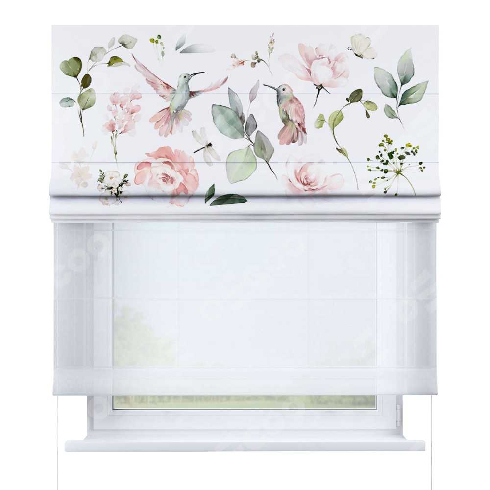 Римская штора день-ночь производителя «Cortin», используется для проёма, пошита из двух полотен, с лицевой блэкаут с нанесением сублимационной печати «Уютный сад», вторая ткань тюль (по стандарту комплектуется тюль белого цвета артикул V-01). Имеет универсальный механизм и подходит для монтажа: на потолок, на стену и в нишу.