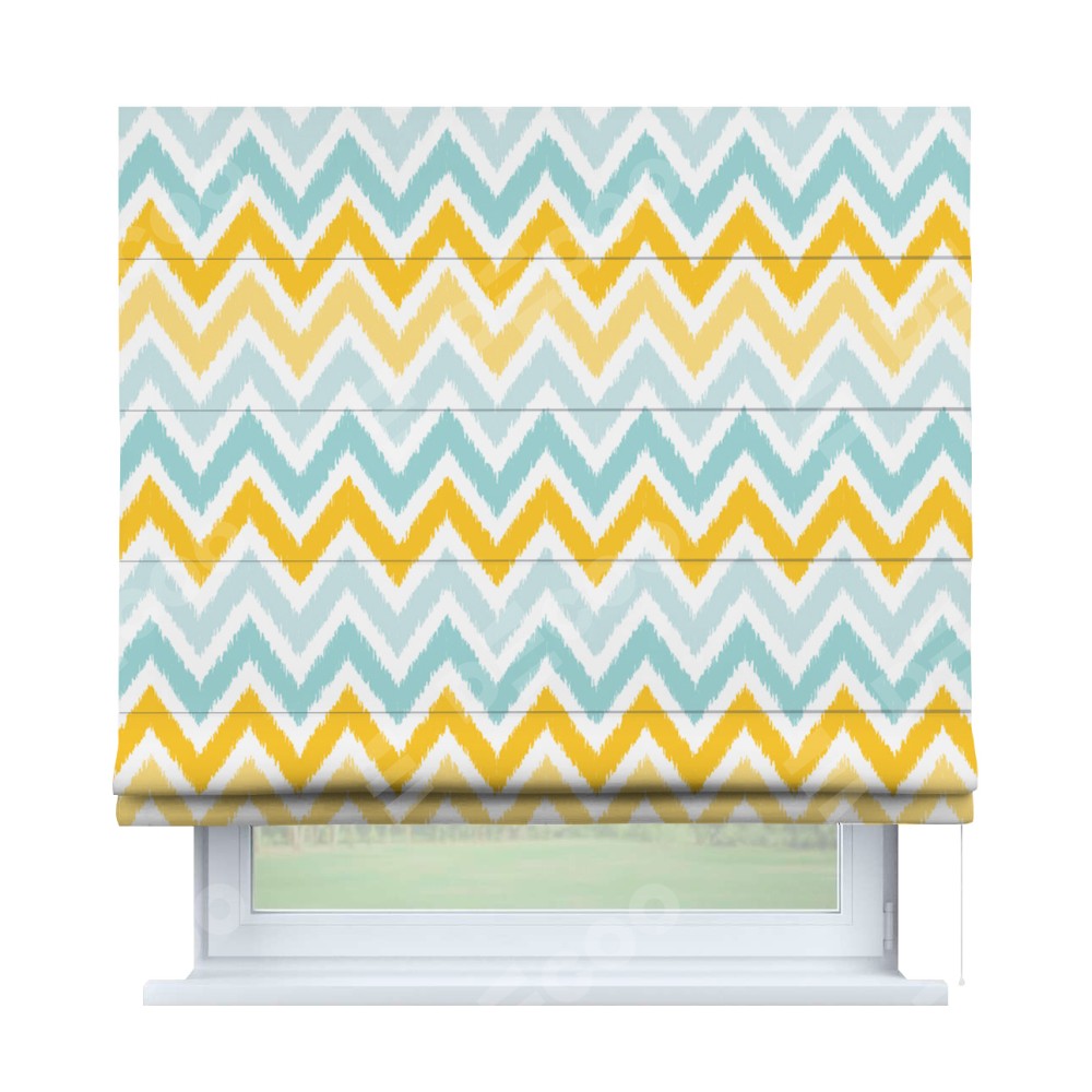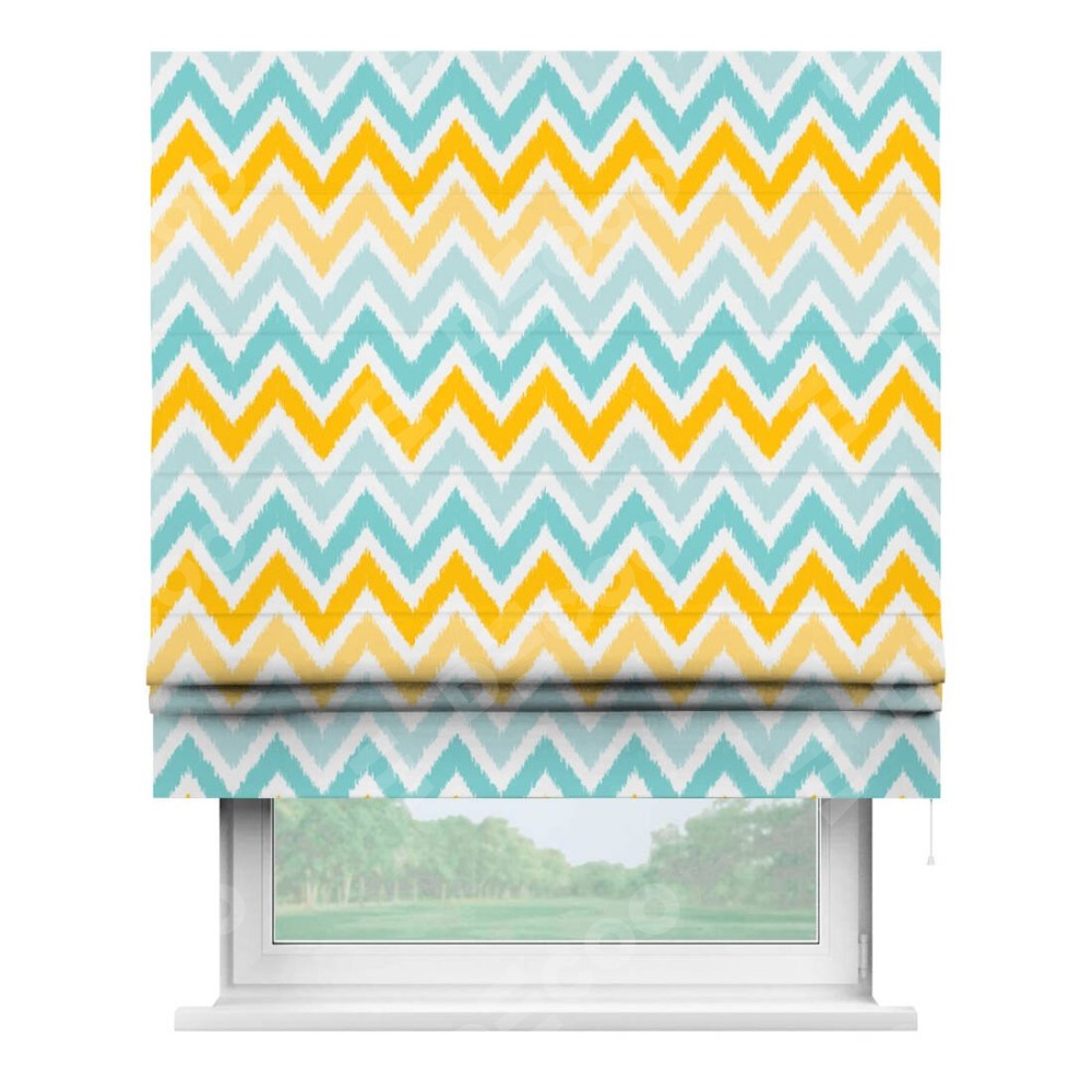 Римская штора производителя «Cortin», используется для проёма, пошита из ткани блэкаут с нанесением сублимационной печати «Икат шеврон». Имеет универсальный механизм и подходит для монтажа: на потолок, на стену и в нишу.