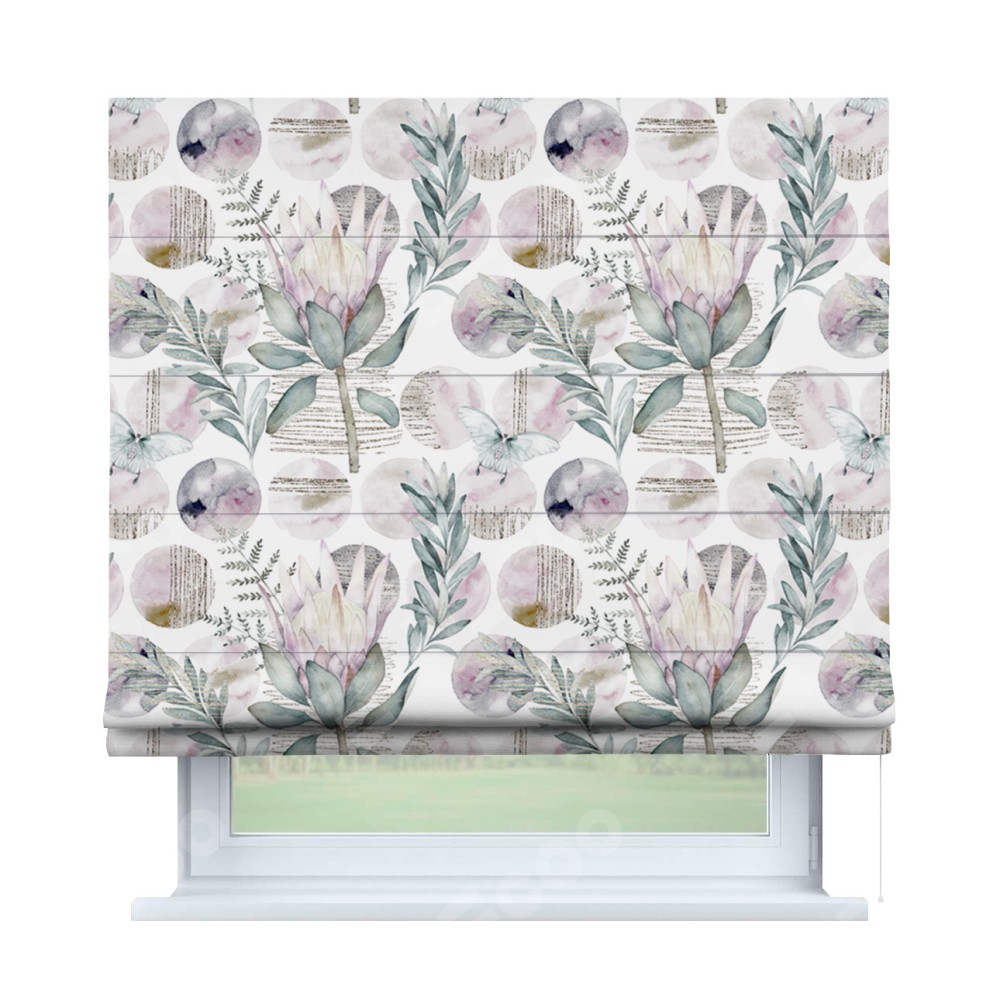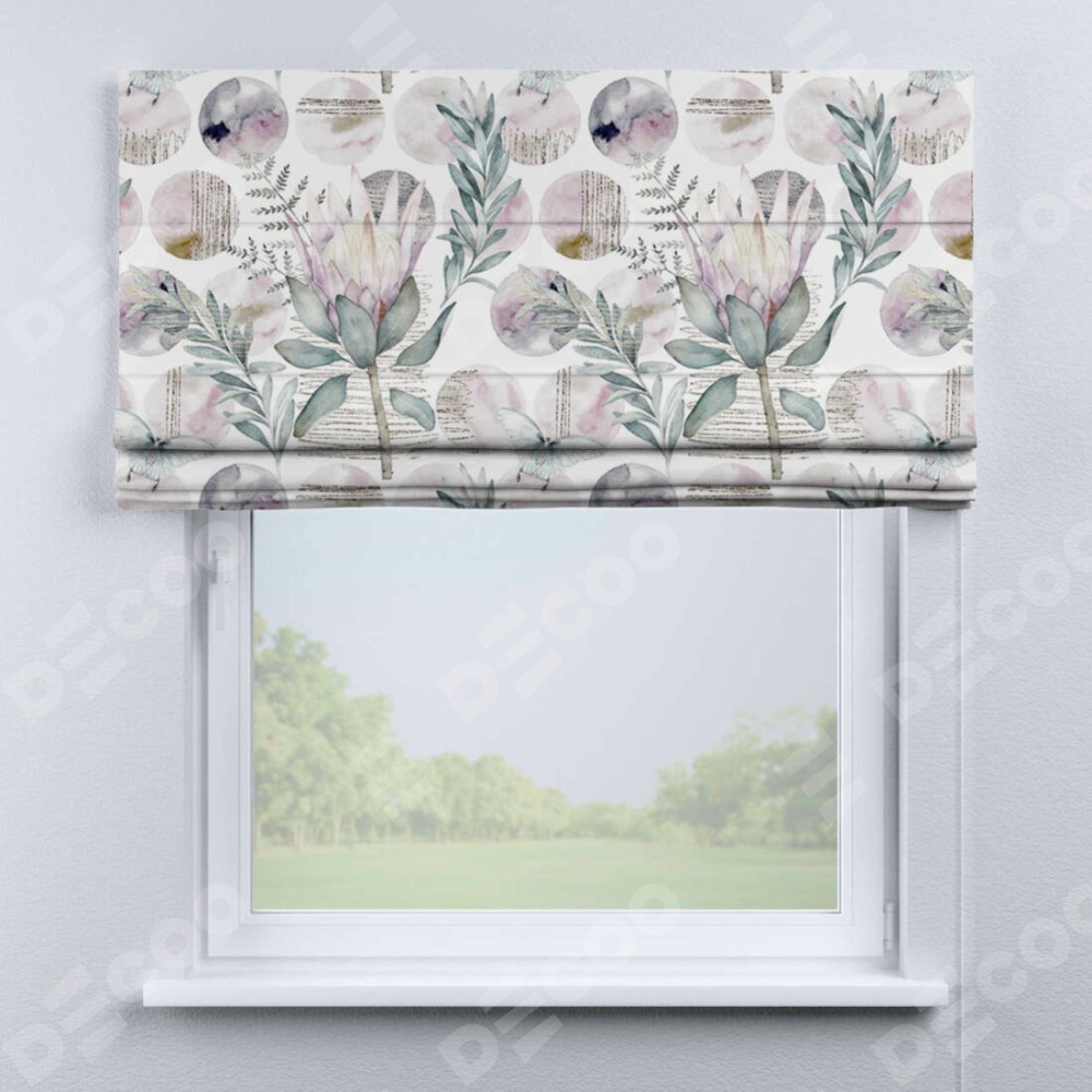 Римская штора производителя «Cortin», используется для проёма, пошита из ткани блэкаут с нанесением сублимационной печати «Розовый лотос». Имеет универсальный механизм и подходит для монтажа: на потолок, на стену и в нишу.