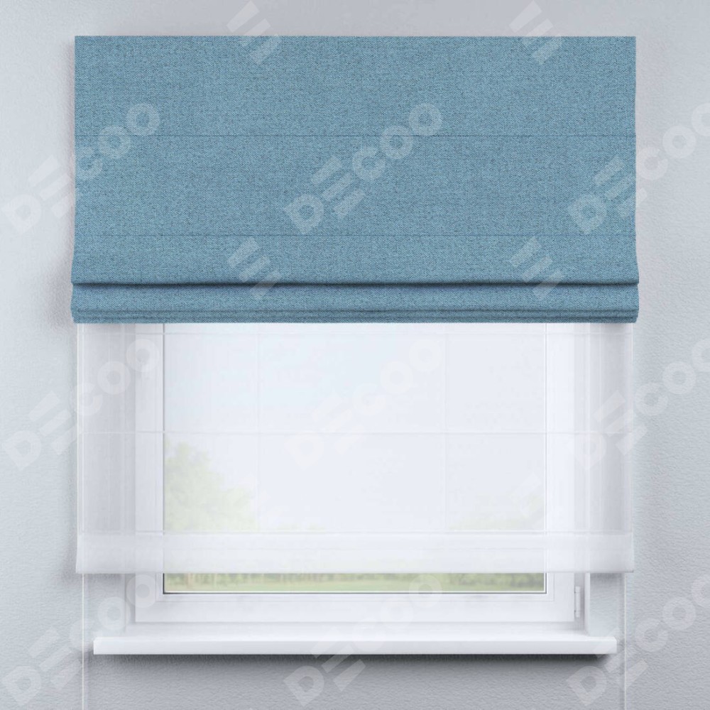Римская штора день-ночь производителя «Cortin», используется для проёма, пошита из двух полотен, с лицевой стороны лён блэкаут голубой артикул 69574, вторая ткань тюль (по стандарту комплектуется тюль белого цвета артикул V-01). Имеет универсальный механизм и подходит для монтажа: на потолок, на стену и в нишу.