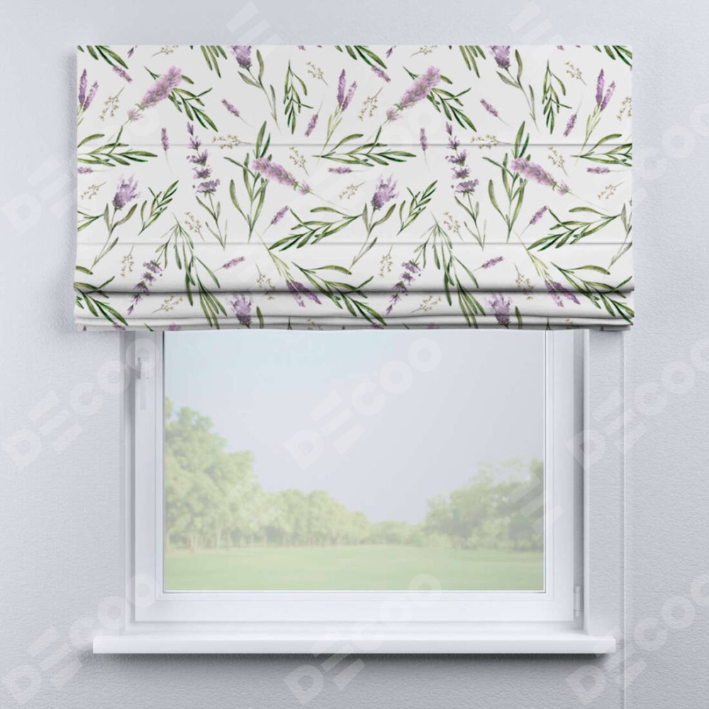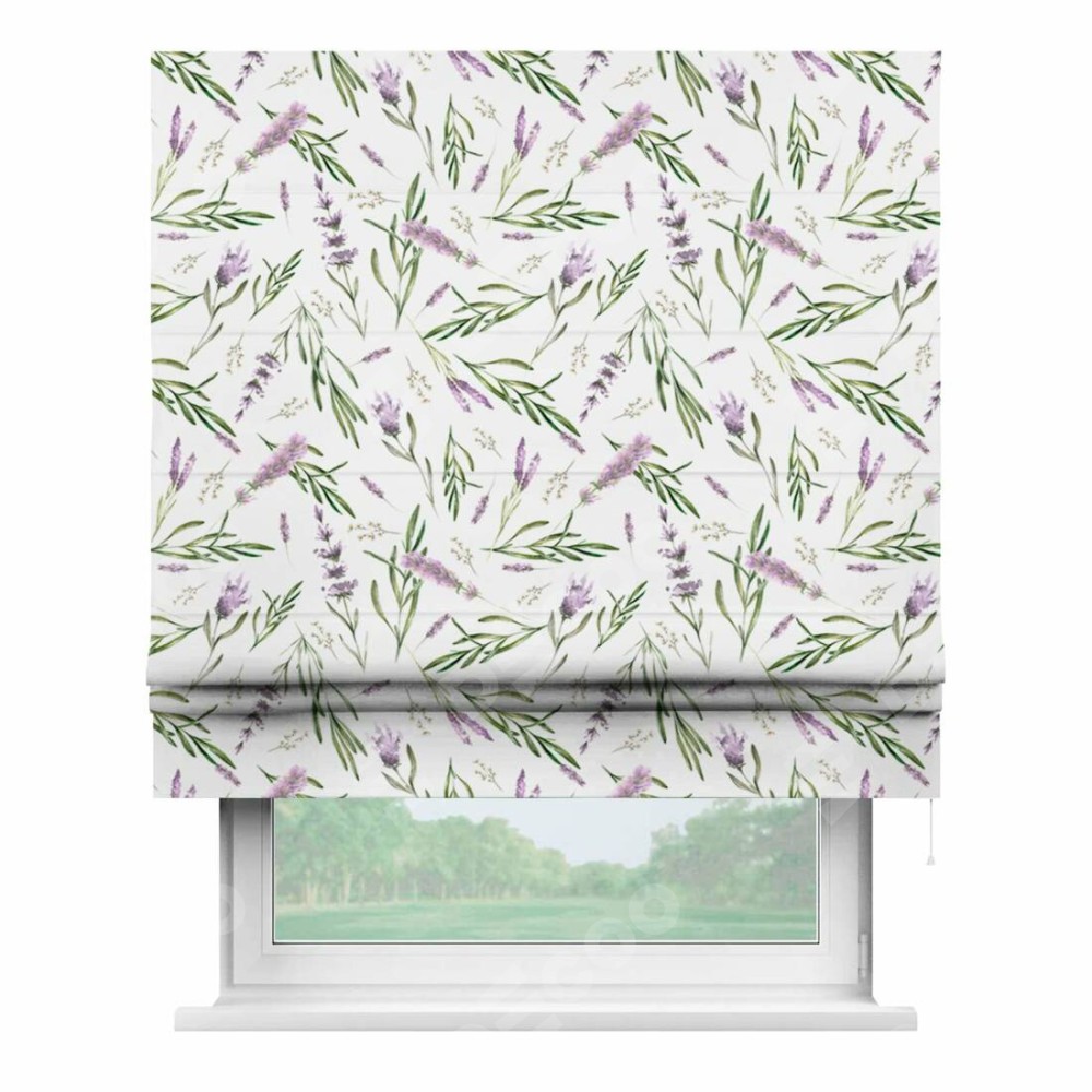 Римская штора производителя «Cortin», используется для проёма, пошита из ткани блэкаут с нанесением сублимационной печати «Лавандовое поле». Имеет универсальный механизм и подходит для монтажа: на потолок, на стену и в нишу.