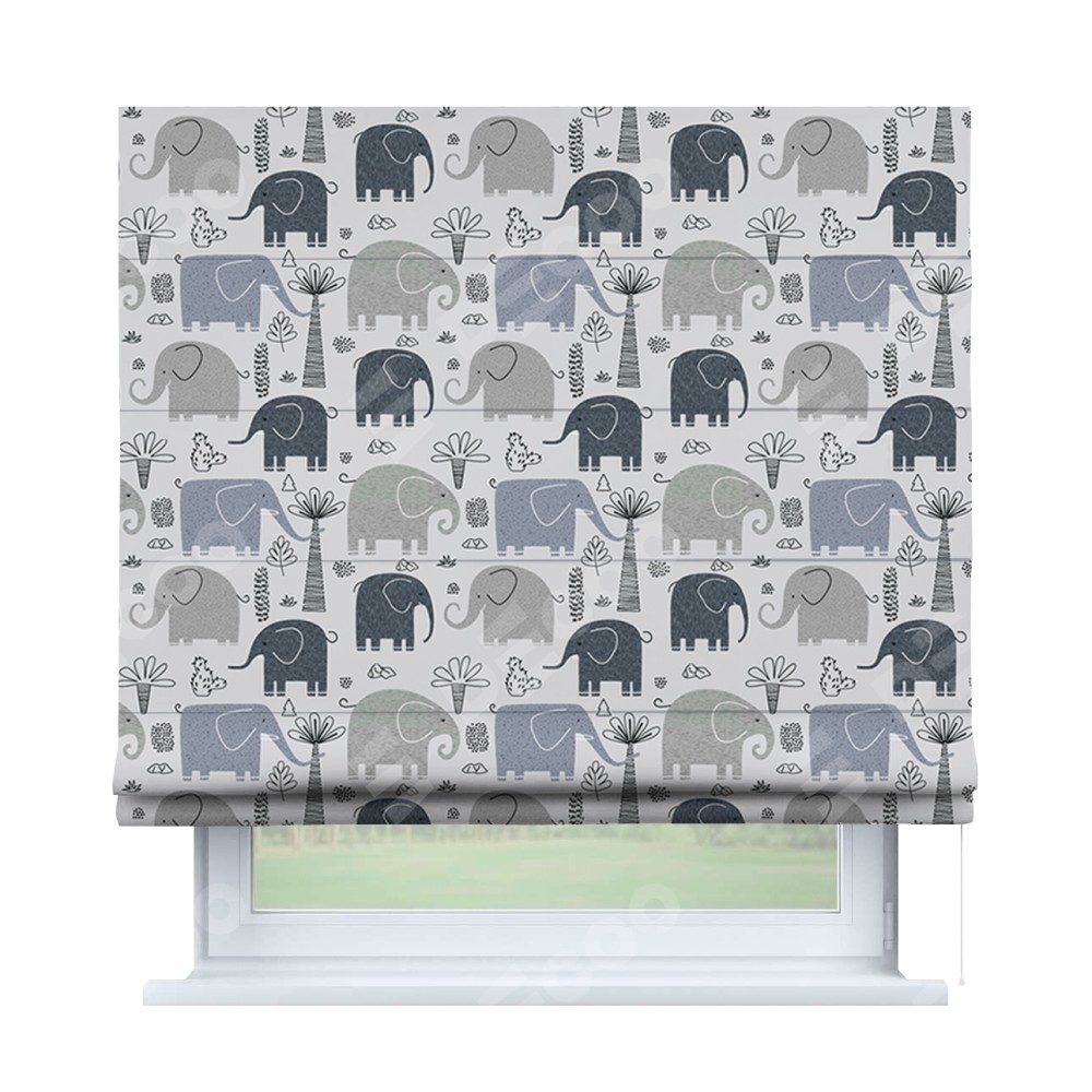 Римская штора производителя «Cortin», используется для проёма, пошита из ткани блэкаут с нанесением сублимационной печати «Серые слоники». Имеет универсальный механизм и подходит для монтажа: на потолок, на стену и в нишу.