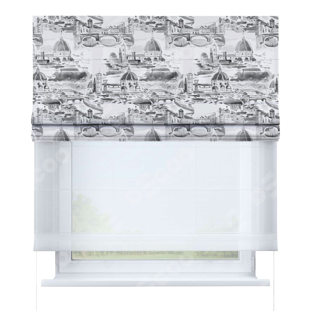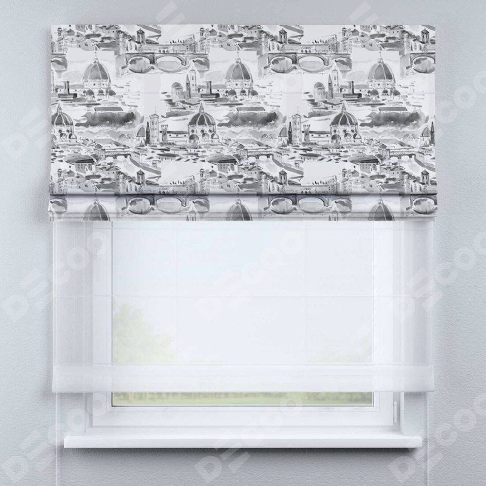 Римская штора день-ночь производителя «Cortin», используется для проёма, пошита из двух полотен, с лицевой блэкаут с нанесением сублимационной печати «Старый город», вторая ткань тюль (по стандарту комплектуется тюль белого цвета артикул V-01). Имеет универсальный механизм и подходит для монтажа: на потолок, на стену и в нишу.