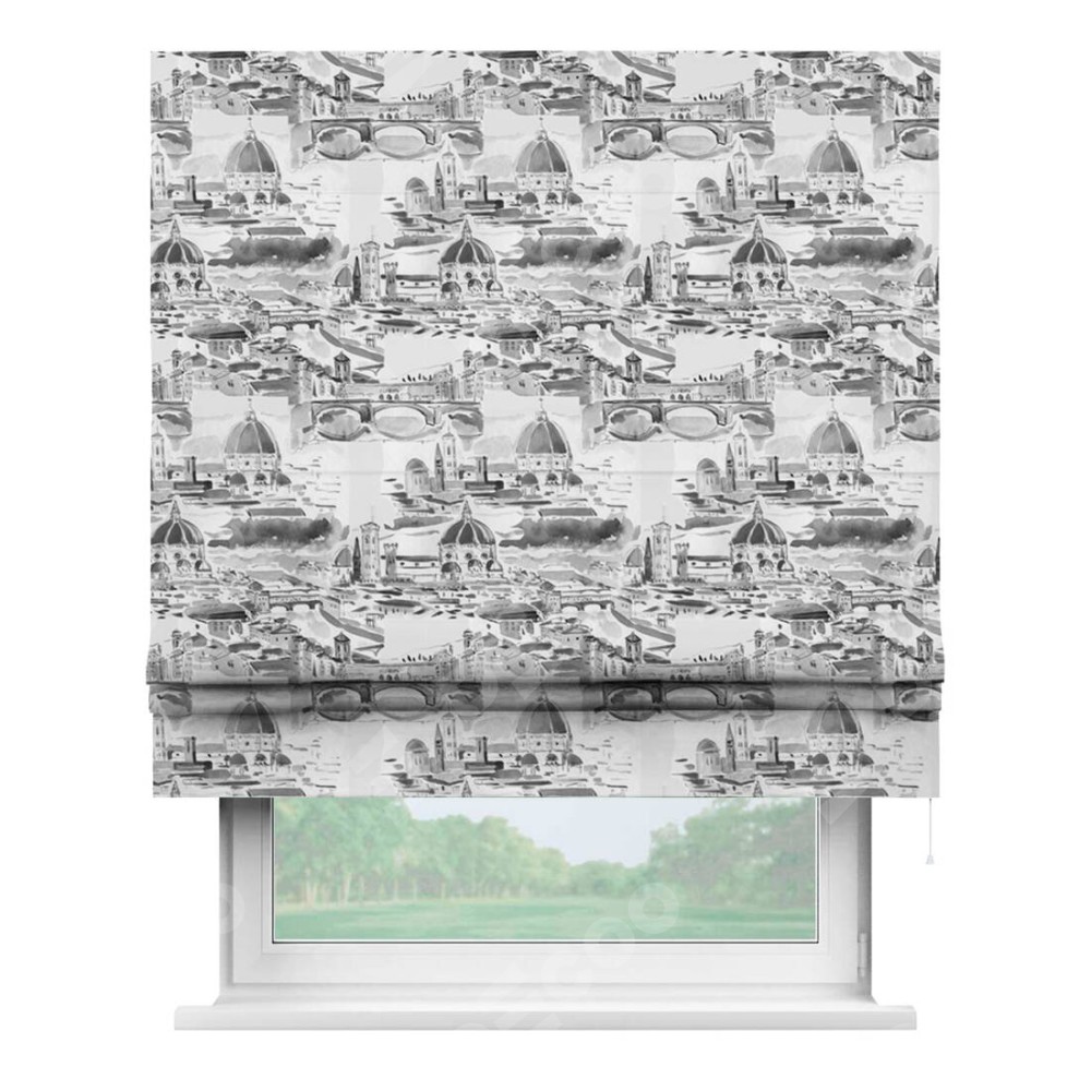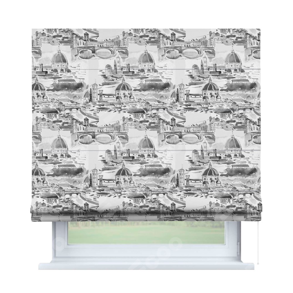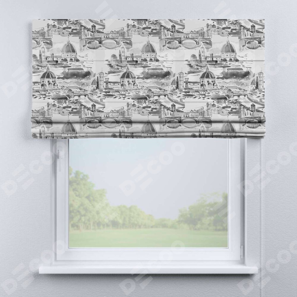 Римская штора производителя «Cortin», используется для проёма, пошита из ткани блэкаут с нанесением сублимационной печати «Старый город». Имеет универсальный механизм и подходит для монтажа: на потолок, на стену и в нишу.