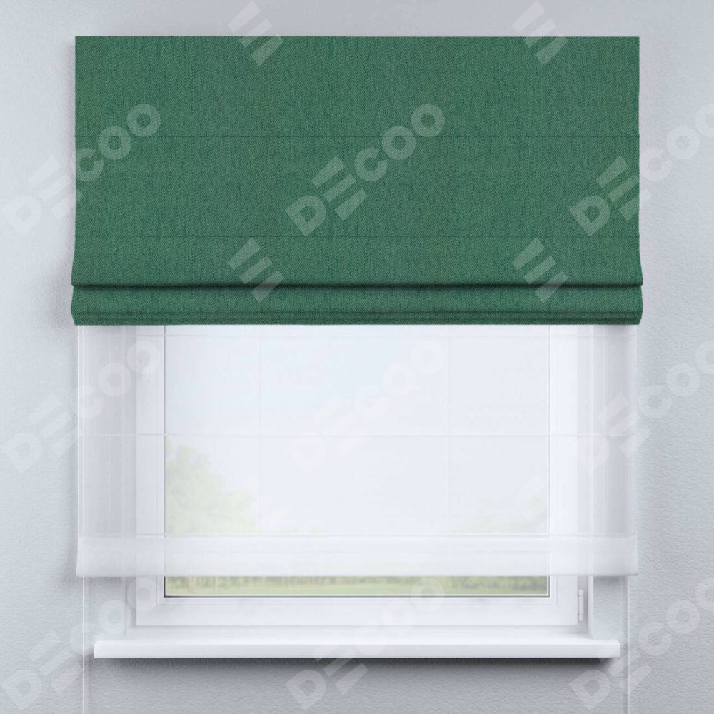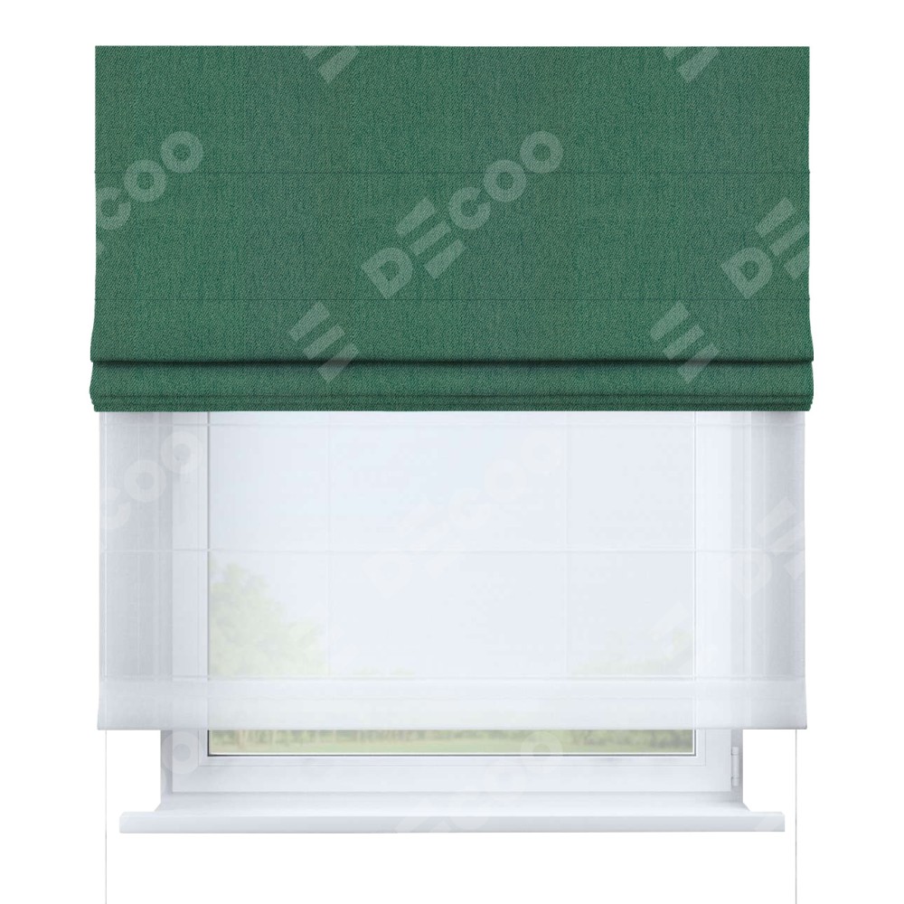 Римская штора день-ночь производителя «Cortin», используется для проёма, пошита из двух полотен, с лицевой стороны твид блэкаут зелёный артикул 21589, вторая ткань тюль (по стандарту комплектуется тюль белого цвета артикул V-01). Имеет универсальный механизм и подходит для монтажа: на потолок, на стену и в нишу.