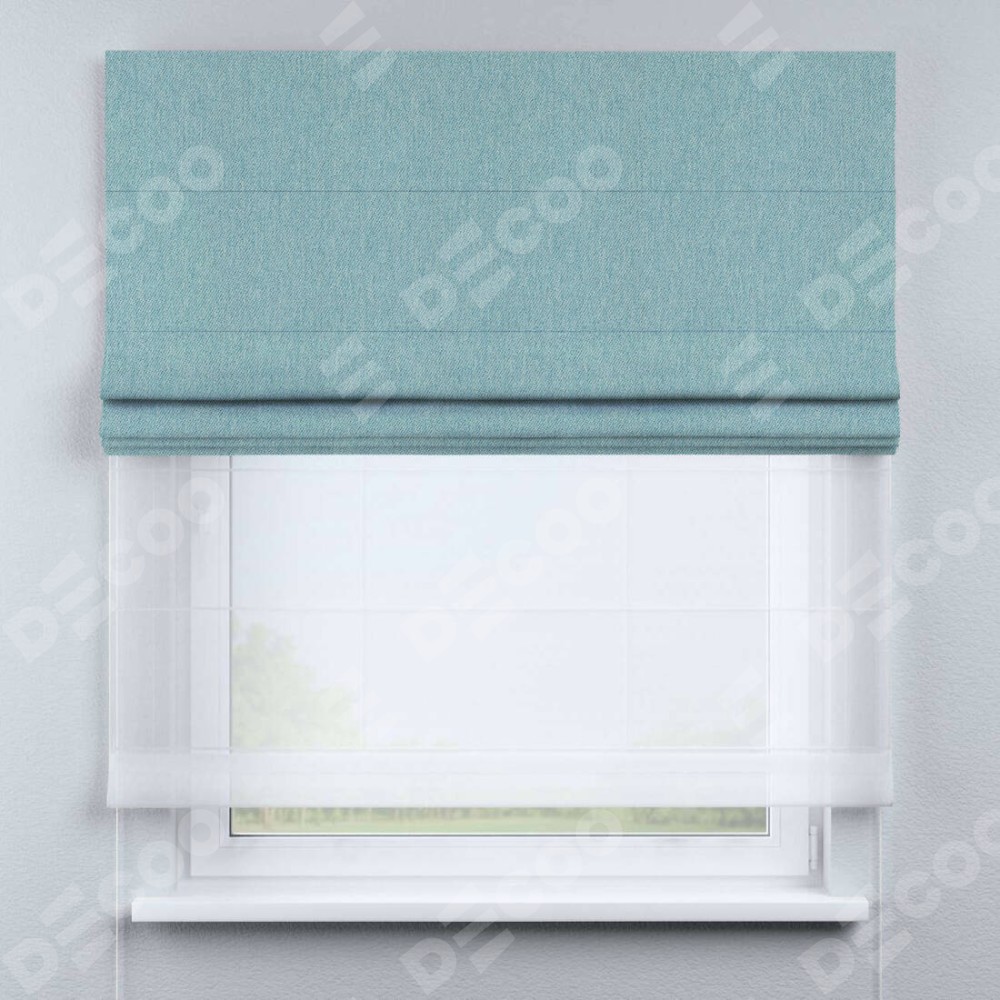 Римская штора день-ночь производителя «Cortin», используется для проёма, пошита из двух полотен, с лицевой стороны твид блэкаут небесно-голубой артикул 21578, вторая ткань тюль (по стандарту комплектуется тюль белого цвета артикул V-01). Имеет универсальный механизм и подходит для монтажа: на потолок, на стену и в нишу.