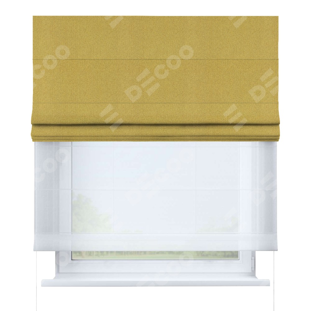 Римская штора день-ночь производителя «Cortin», используется для проёма, пошита из двух полотен, с лицевой стороны твид блэкаут пыльная горчица артикул 21588, вторая ткань тюль (по стандарту комплектуется тюль белого цвета артикул V-01). Имеет универсальный механизм и подходит для монтажа: на потолок, на стену и в нишу.