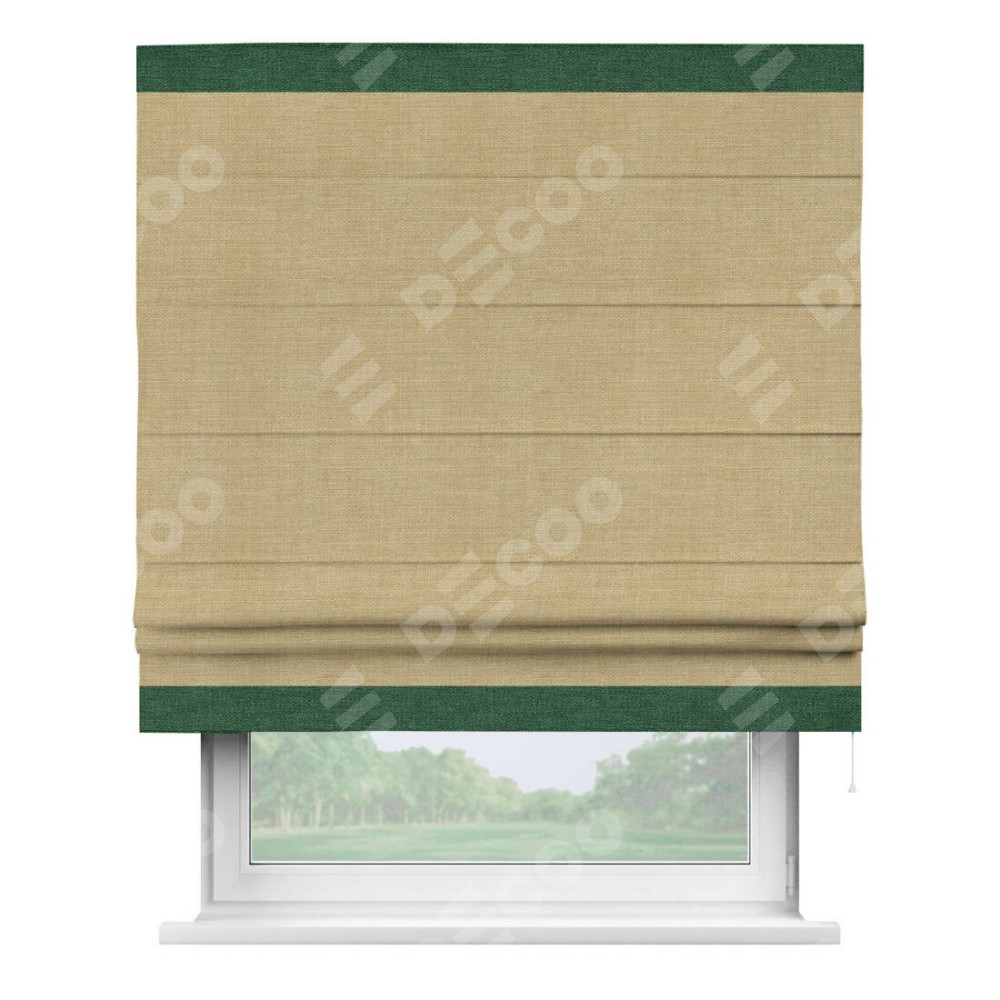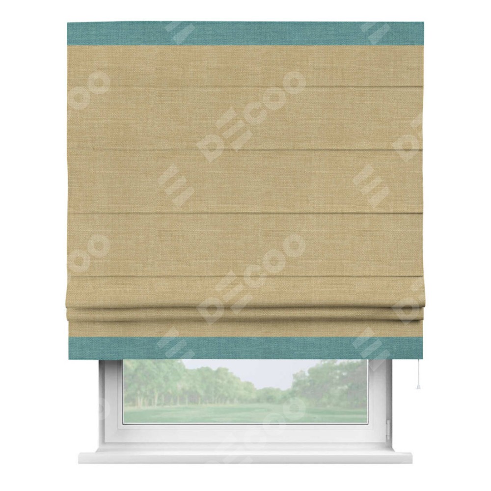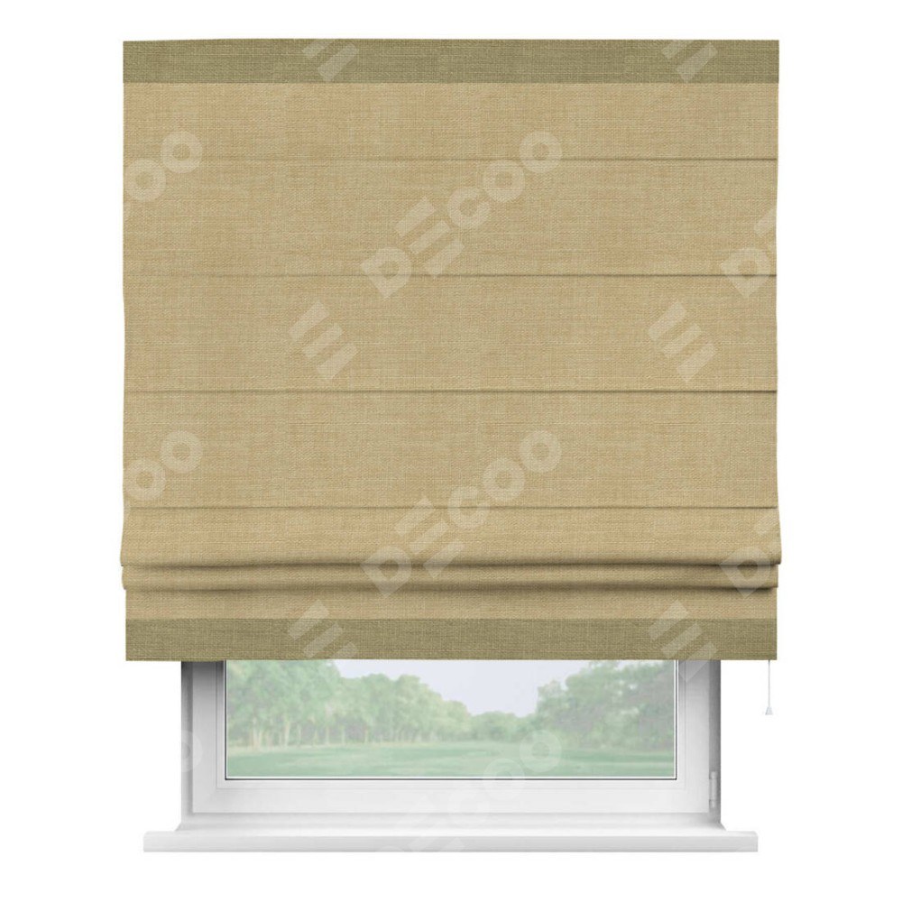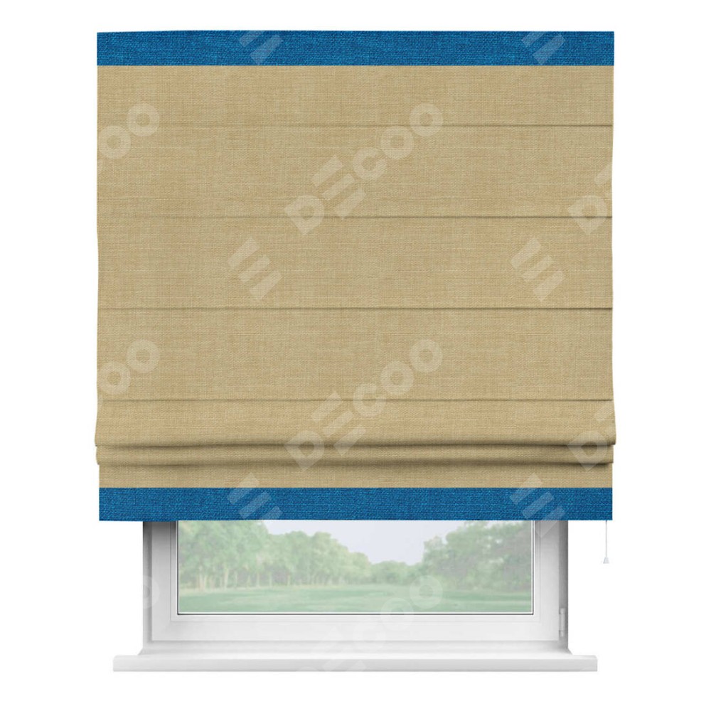Римская штора производителя «Cortin», используется для проёма, пошита из ткани лён бежевый, артикул 7442. Отделка шторы кантом «Горизонт», ткань для канта используется из льна разной расцветки на выбор. Имеет универсальный механизм и подходит для монтажа: на потолок, на стену и в нишу.