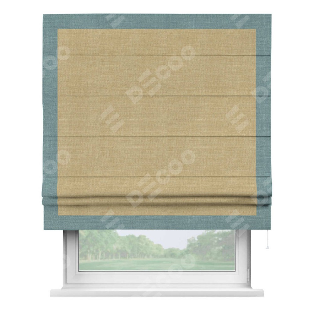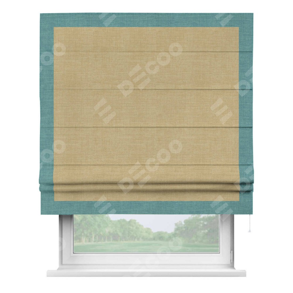 Римская штора производителя «Cortin», используется для проёма, пошита из ткани лён бежевый, артикул 7442. Отделка шторы кантом «Чесс», ткань для канта используется из льна разной расцветки на выбор. Имеет универсальный механизм и подходит для монтажа: на потолок, на стену и в нишу.