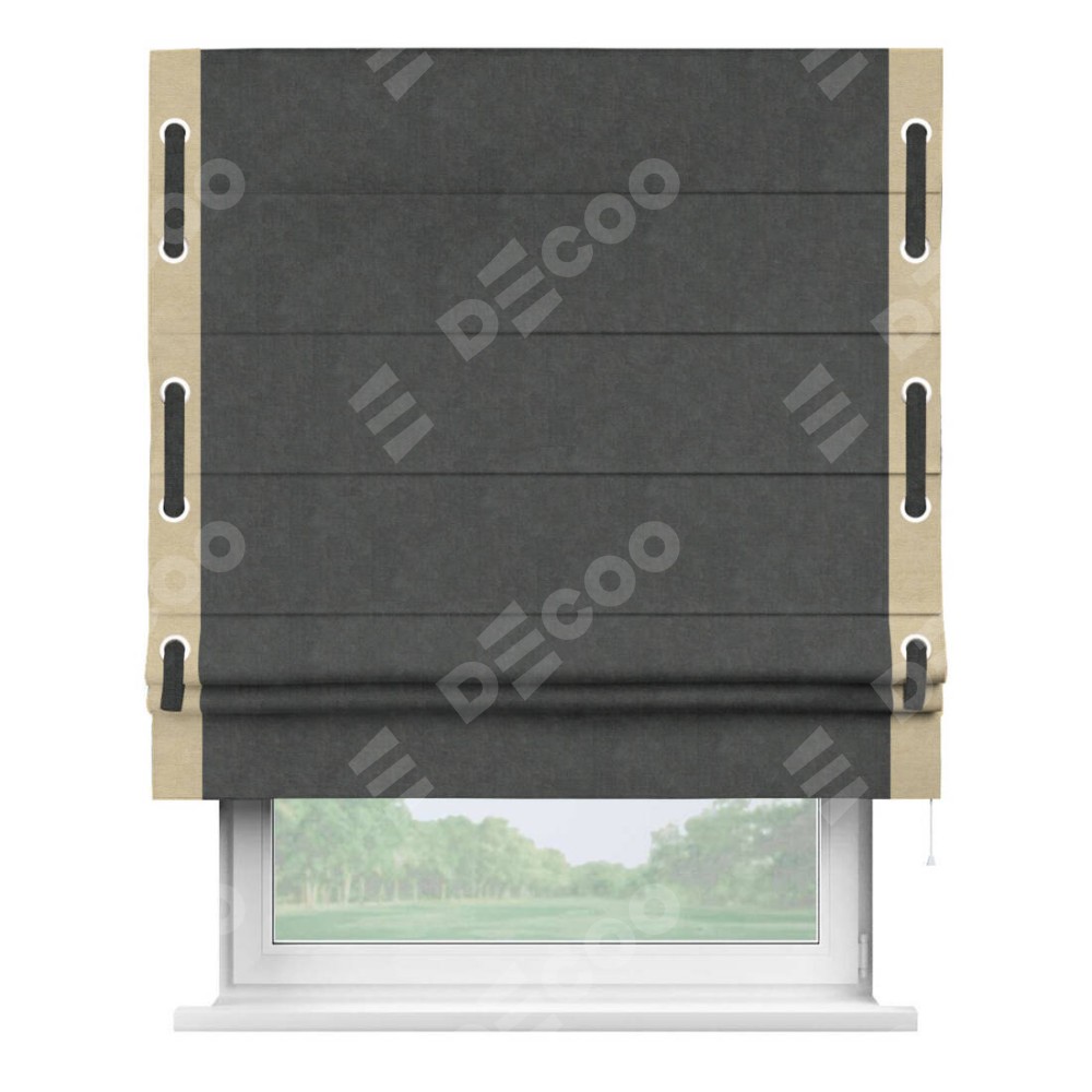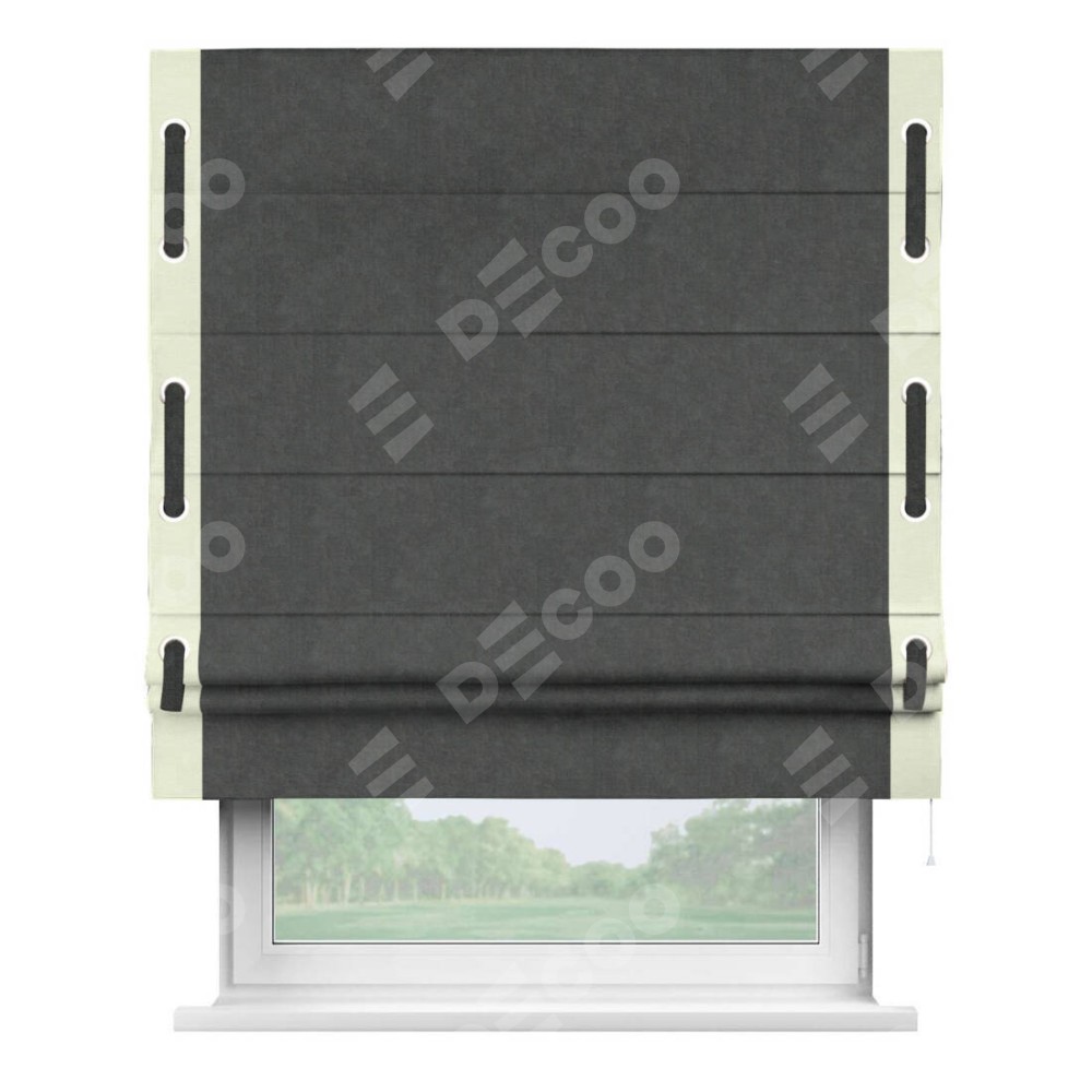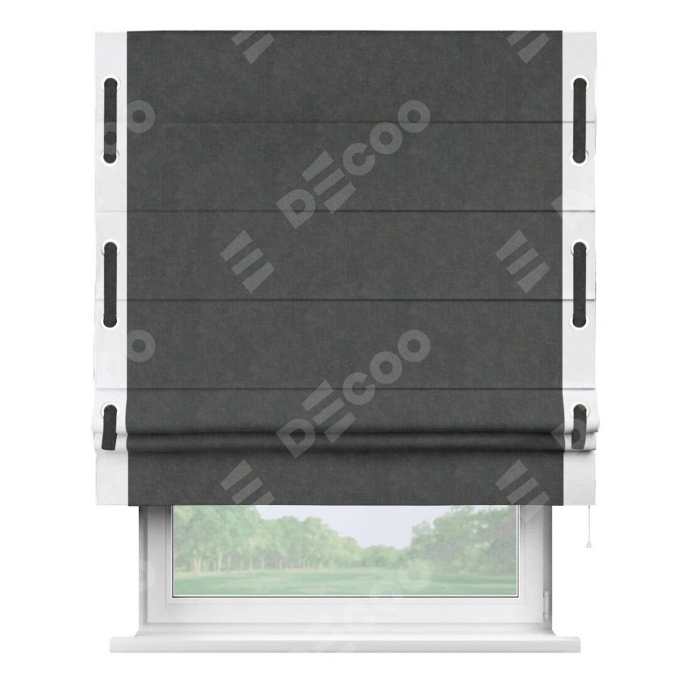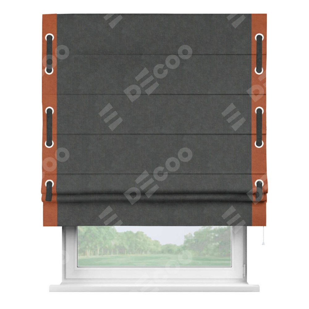 Римская штора производителя «Cortin», используется для проёма, пошита из ткани вельвет тёмно-серый, артикул ткани 33811. Отделка шторы кантом «Стрим Дуо» на кантах расположены люверсы с пояском, ткань для канта используется из вельвета разной расцветки на выбор. Ткань для пояска обычно используется из основной ткани шторы, а так же можно сделать из любой расцветки по желанию. Имеет универсальный механизм и подходит для монтажа: на потолок, на стену и в нишу.