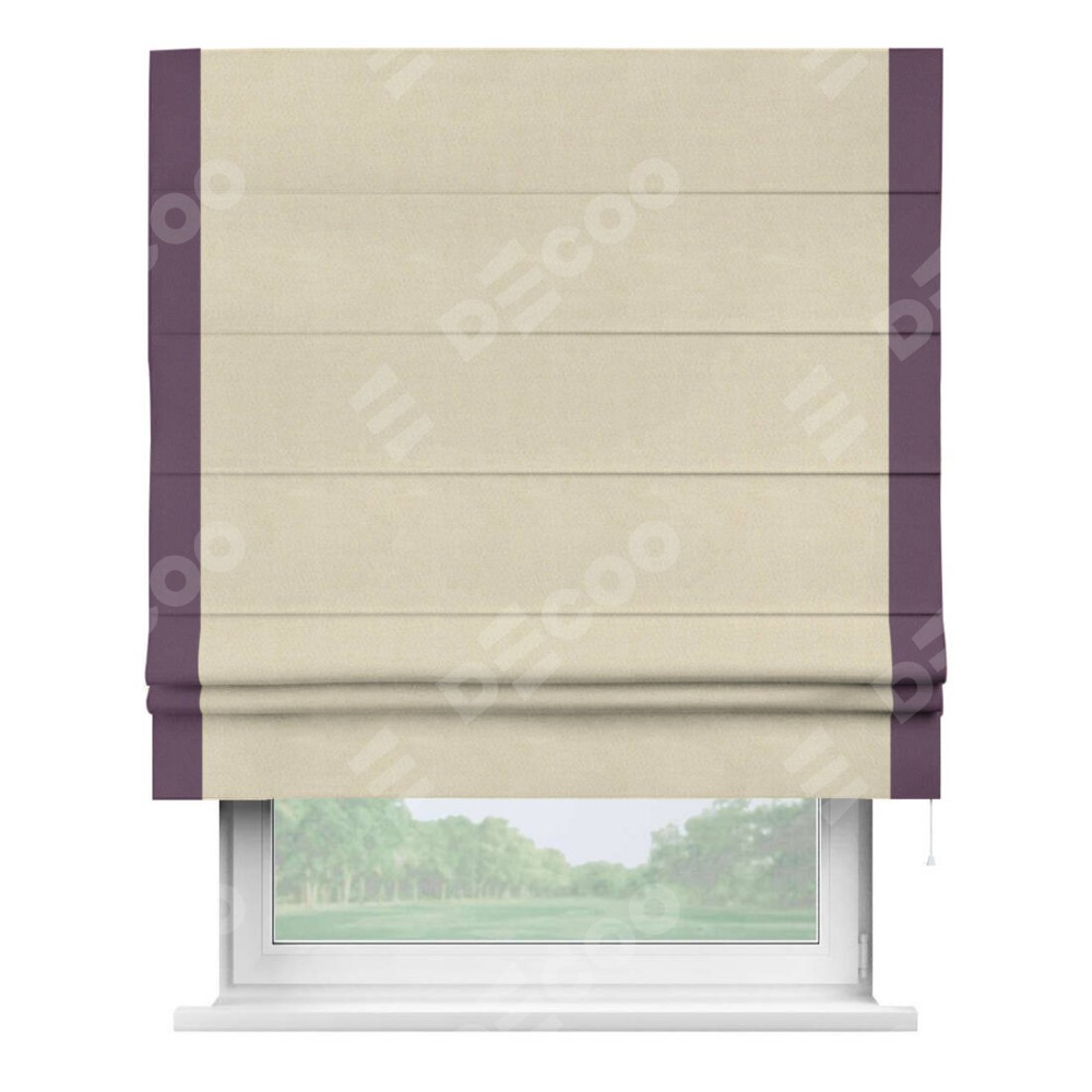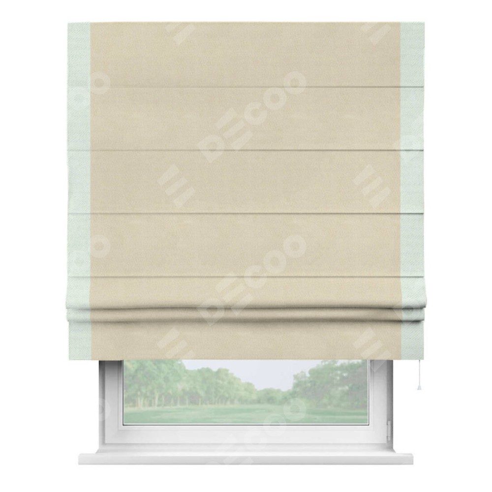 Римская штора производителя «Cortin», используется для проёма, пошита из ткани блэкаут однотонный бежевый, артикул ткани 13125. Отделка шторы кантом «Стрим Дуо», ткань для канта используется из блэкаута однотонного разной расцветки на выбор. Имеет универсальный механизм и подходит для монтажа: на потолок, на стену и в нишу.