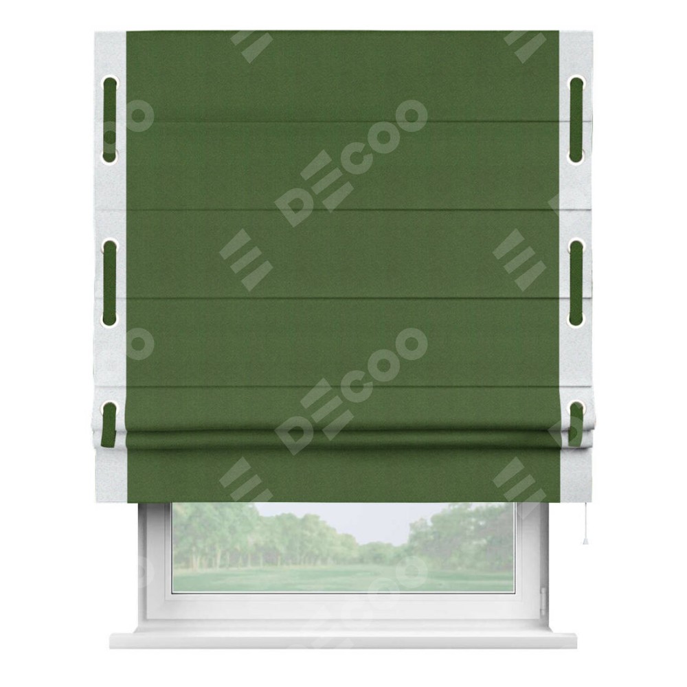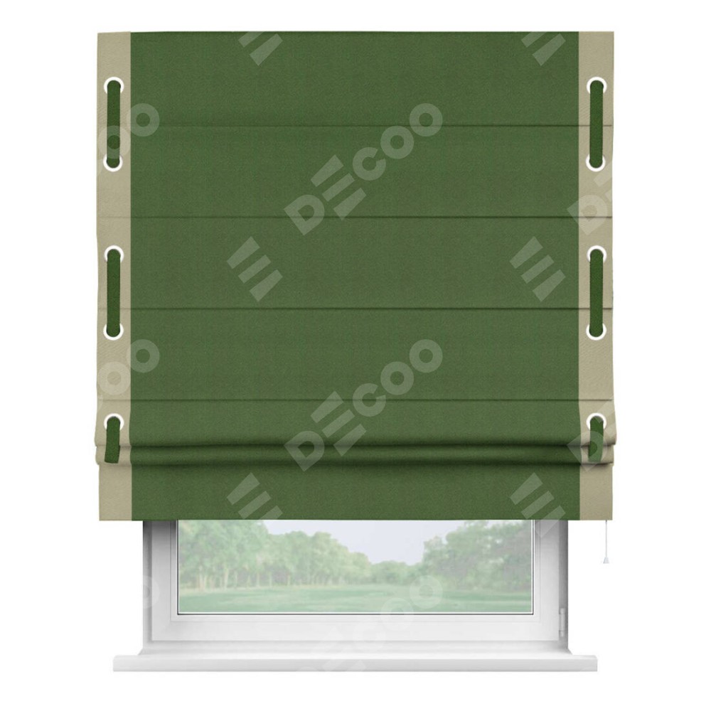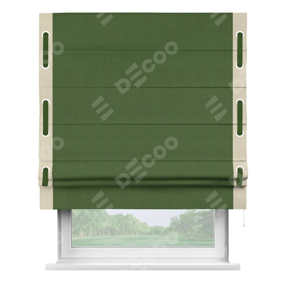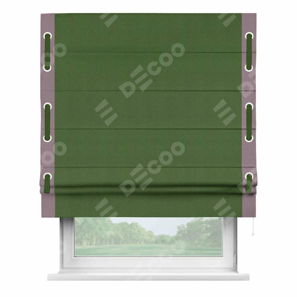 Римская штора производителя «Cortin», используется для проёма, пошита из ткани блэкаут однотонный зелёный перламутр, артикул ткани 81859−2. Отделка шторы кантом «Стрим Дуо» на кантах расположены люверсы с пояском, ткань для канта используется из блэкаута однотонного разной расцветки на выбор. Ткань для пояска обычно используется из основной ткани шторы, а так же можно сделать из любой расцветки по желанию. Имеет универсальный механизм и подходит для монтажа: на потолок, на стену и в нишу.