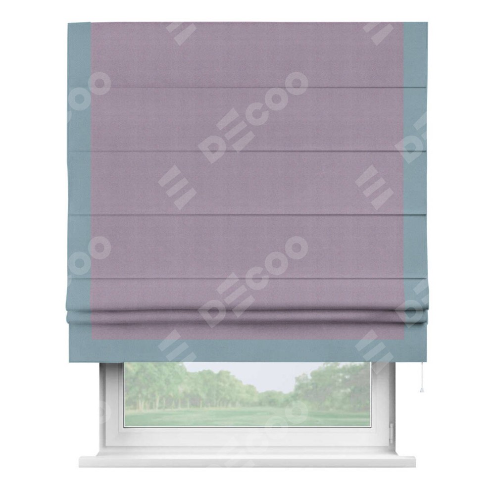 Римская штора производителя «Cortin», используется для проёма, пошита из ткани блэкаут однотонный светло-сиреневый, артикул ткани 29333−1. Отделка шторы кантом «Виктория», ткань для канта используется из блэкаута однотонного разной расцветки на выбор. Имеет универсальный механизм и подходит для монтажа: на потолок, на стену и в нишу.