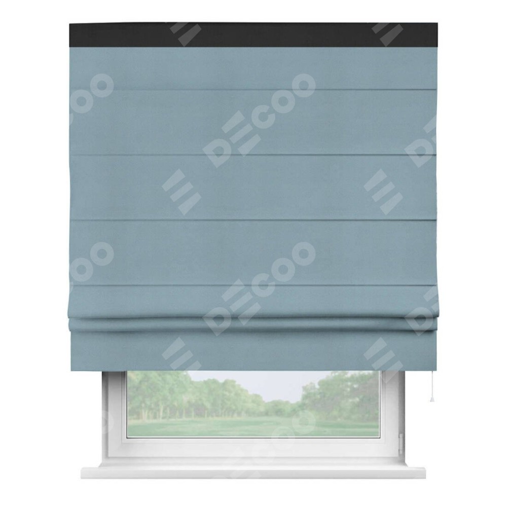 Римская штора производителя «Cortin», используется для проёма, пошита из ткани блэкаут однотонный серо-голубой, артикул ткани 29327−2. Отделка шторы кантом «Кинг», ткань для канта используется из блэкаута однотонного разной расцветки на выбор. Имеет универсальный механизм и подходит для монтажа: на потолок, на стену и в нишу.