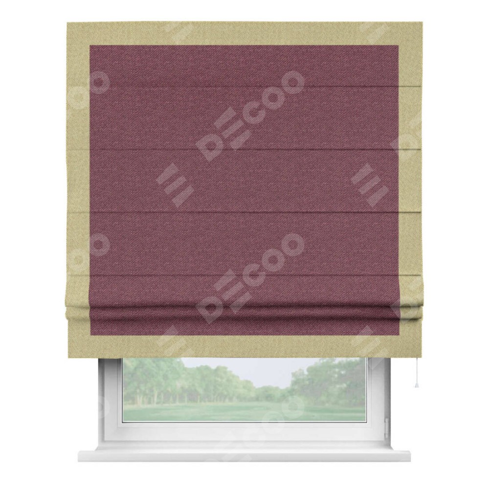 Римская штора производителя «Cortin», используется для проёма, пошита из ткани лён димаут марсала, артикул 1602. Отделка шторы кантом «Чесс», ткань для канта используется из льна димаут разной расцветки на выбор. Имеет универсальный механизм и подходит для монтажа: на потолок, на стену и в нишу.