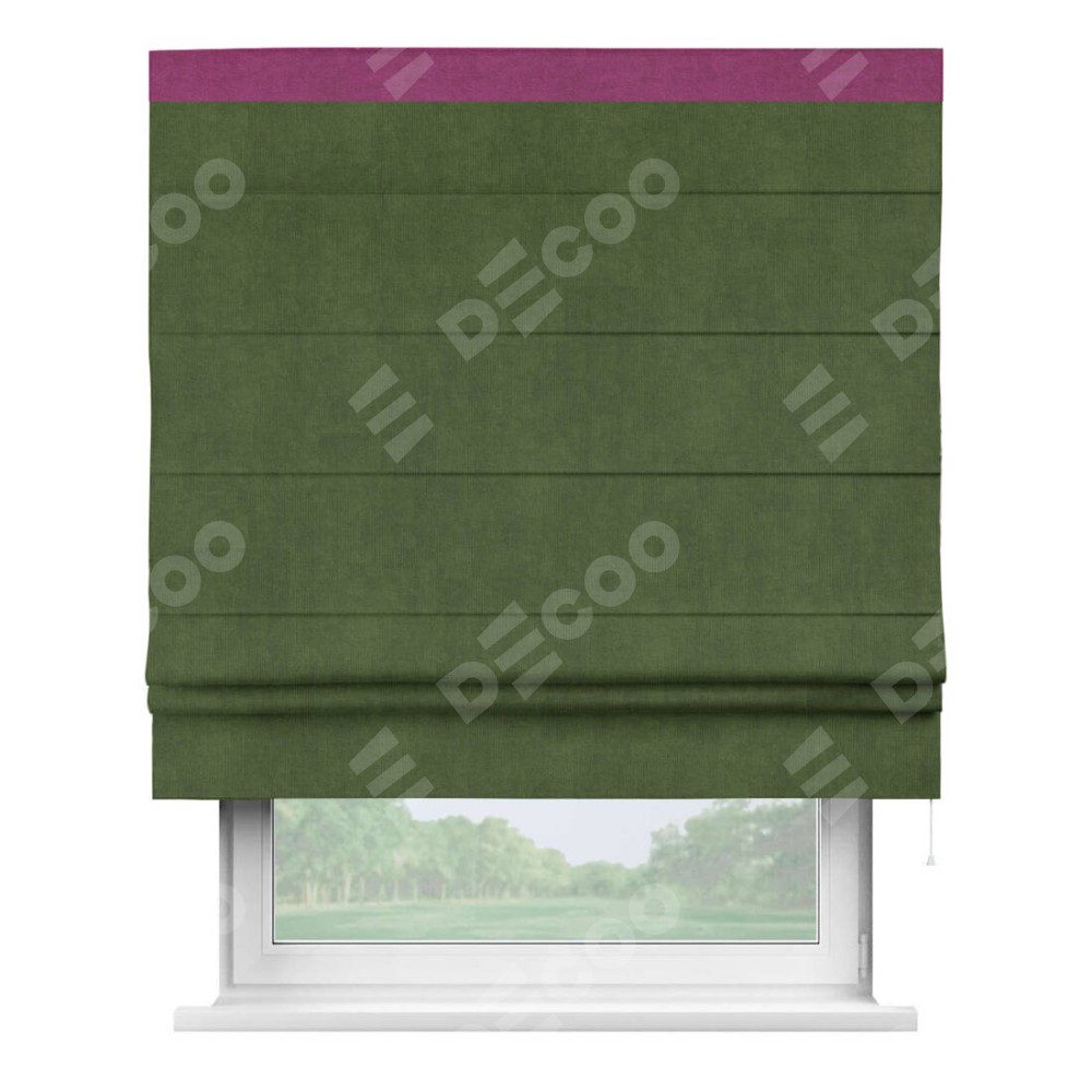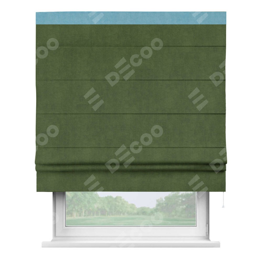 Римская штора производителя «Cortin», используется для проёма, пошита из ткани вельвет тёмно-салатовый, артикул ткани 33805. Отделка шторы кантом «Кинг», ткань для канта используется из вельвета разной расцветки на выбор. Имеет универсальный механизм и подходит для монтажа: на потолок, на стену и в нишу.