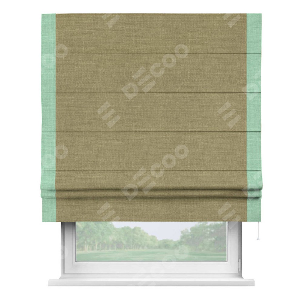 Римская штора производителя «Cortin», используется для проёма, пошита из ткани лён коричневый, артикул 7443. Отделка шторы кантом «Стрим Дуо», ткань для канта используется из льна разной расцветки на выбор. Имеет универсальный механизм и подходит для монтажа: на потолок, на стену и в нишу.