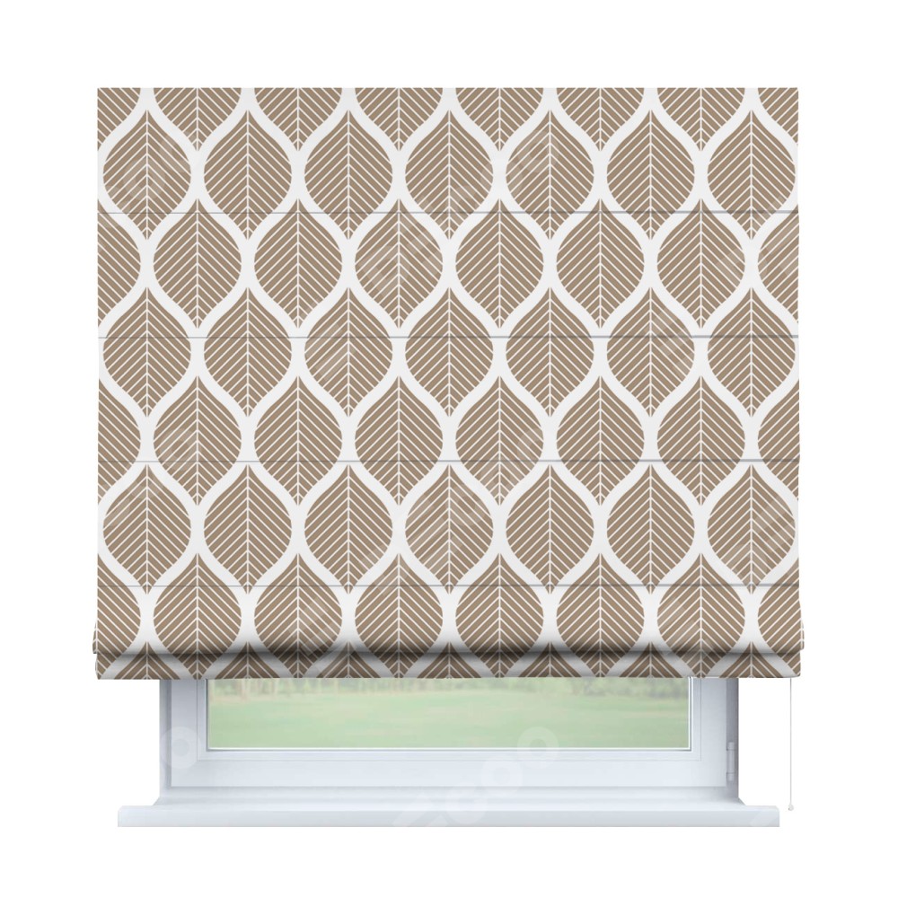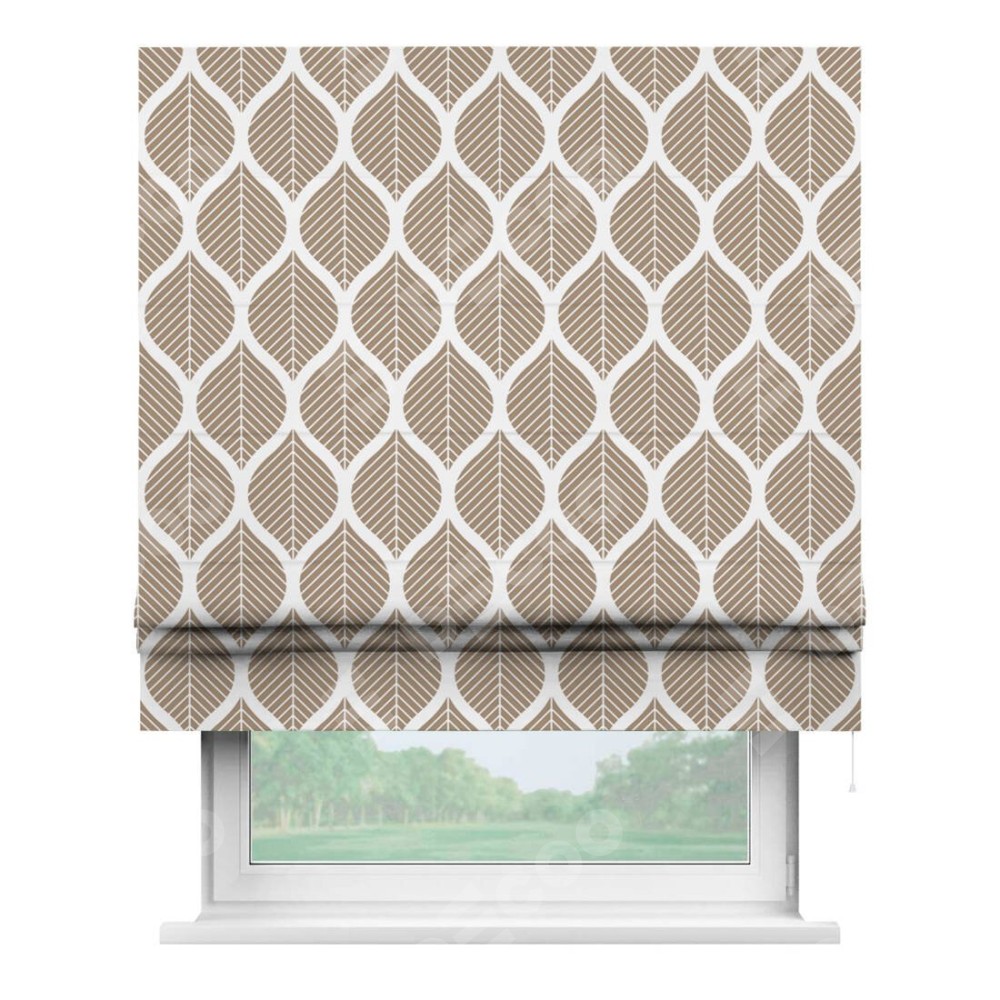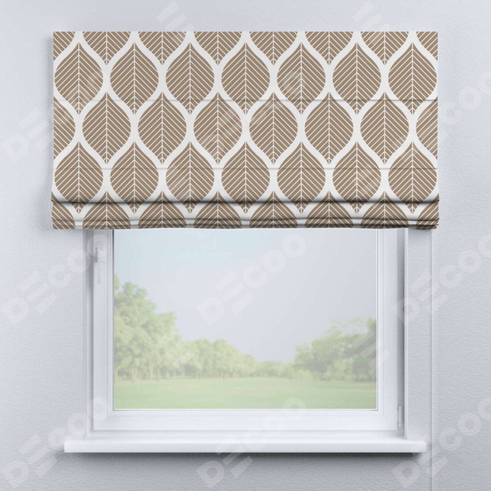 Римская штора производителя «Cortin», используется для проёма, пошита из ткани блэкаут с нанесением сублимационной печати «Листья геометрия». Имеет универсальный механизм и подходит для монтажа: на потолок, на стену и в нишу.