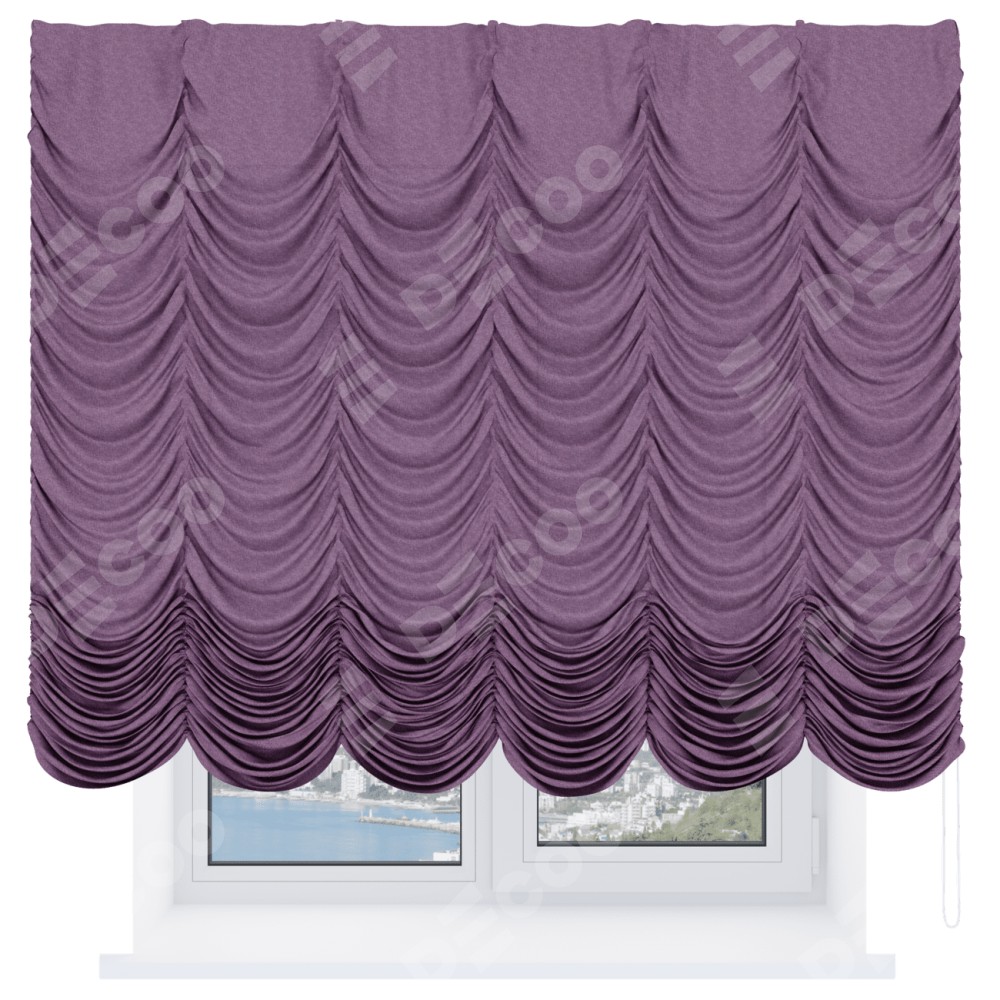 Французская штора производителя «Cortin», используется для проёма, пошита из ткани лён кашемир сиреневый, артикул ткани 21620. Имеет универсальный механизм и подходит для монтажа: на потолок и на стену.