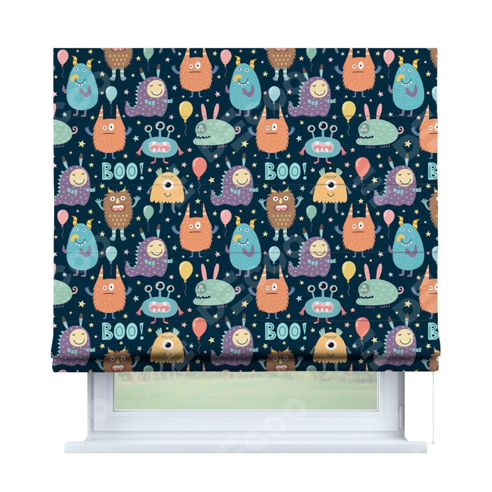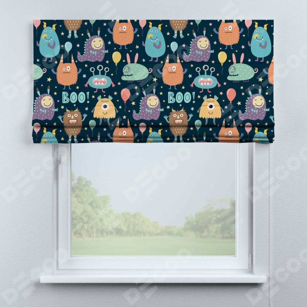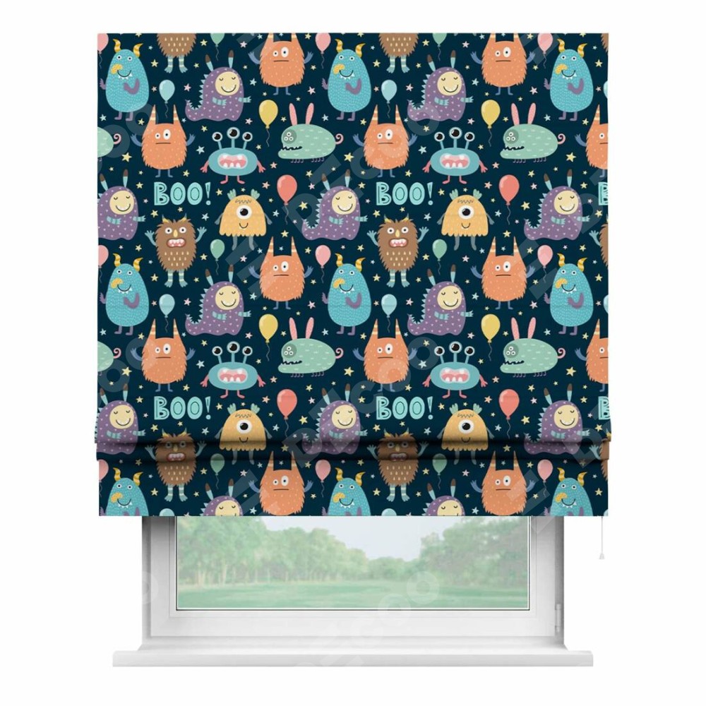 Римская штора производителя «Cortin», используется для проёма, пошита из ткани блэкаут с нанесением сублимационной печати «Звёздные страшилки». Имеет универсальный механизм и подходит для монтажа: на потолок, на стену и в нишу.