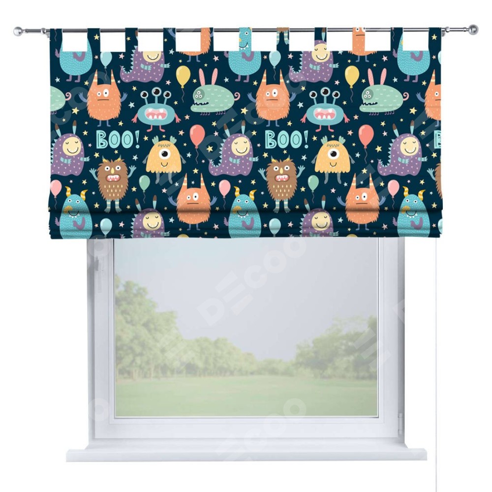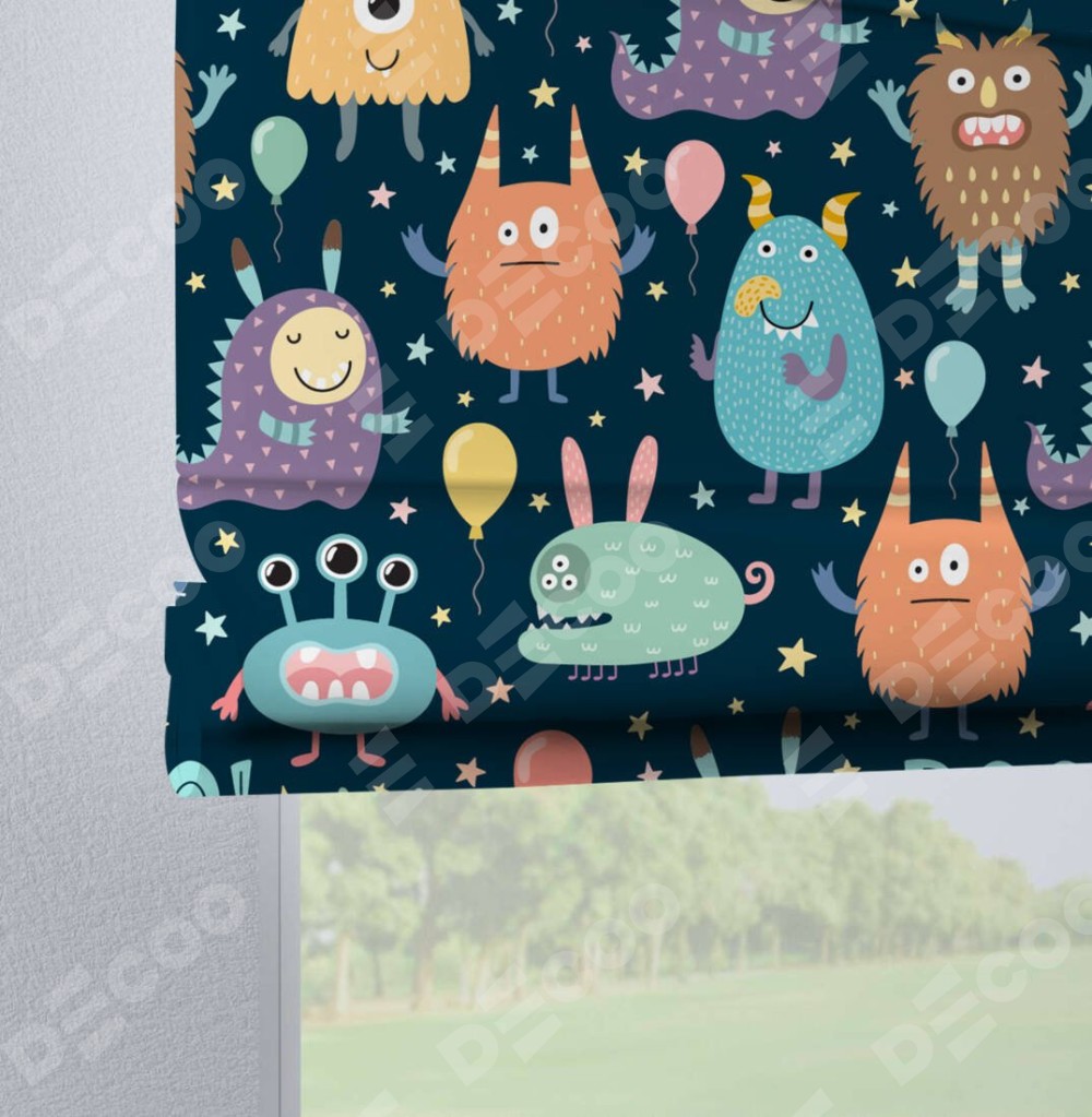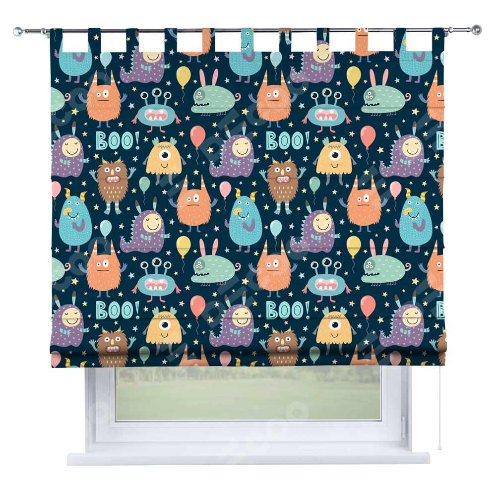 Римская штора производителя «Cortin», используется для проёма, пошита из ткани блэкаут с нанесением сублимационной печати «Звёздные страшилки». Данная модель пошита на петлях, комплектуется на выбор круглым карнизом и подходит для монтажа на стену. Римская штора на петлях имеет простую систему регулировки высоты, отличительным преимуществом данной модели является простой способ монтажа. Достаточно повесить ее на трубу и штора готова!