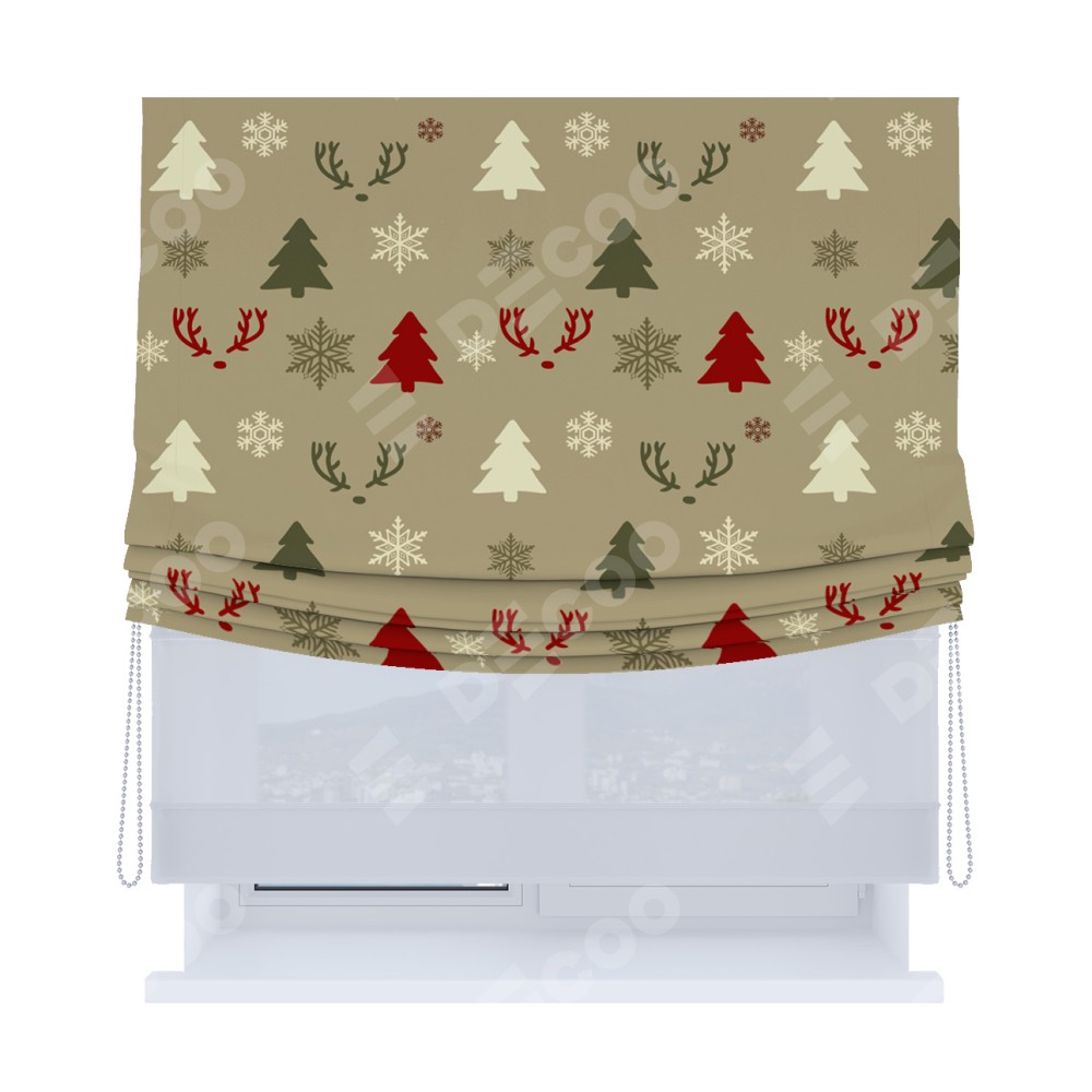 Римская штора день-ночь производителя «Cortin», используется для проёма, пошита из двух полотен, с лицевой блэкаут с нанесением сублимационной печати «Гармония рождества», вторая ткань тюль (по стандарту комплектуется тюль белого цвета артикул V-01). Имеет универсальный механизм и подходит для монтажа: на потолок, на стену и в нишу. Удобное управление каждой шторой отдельно.